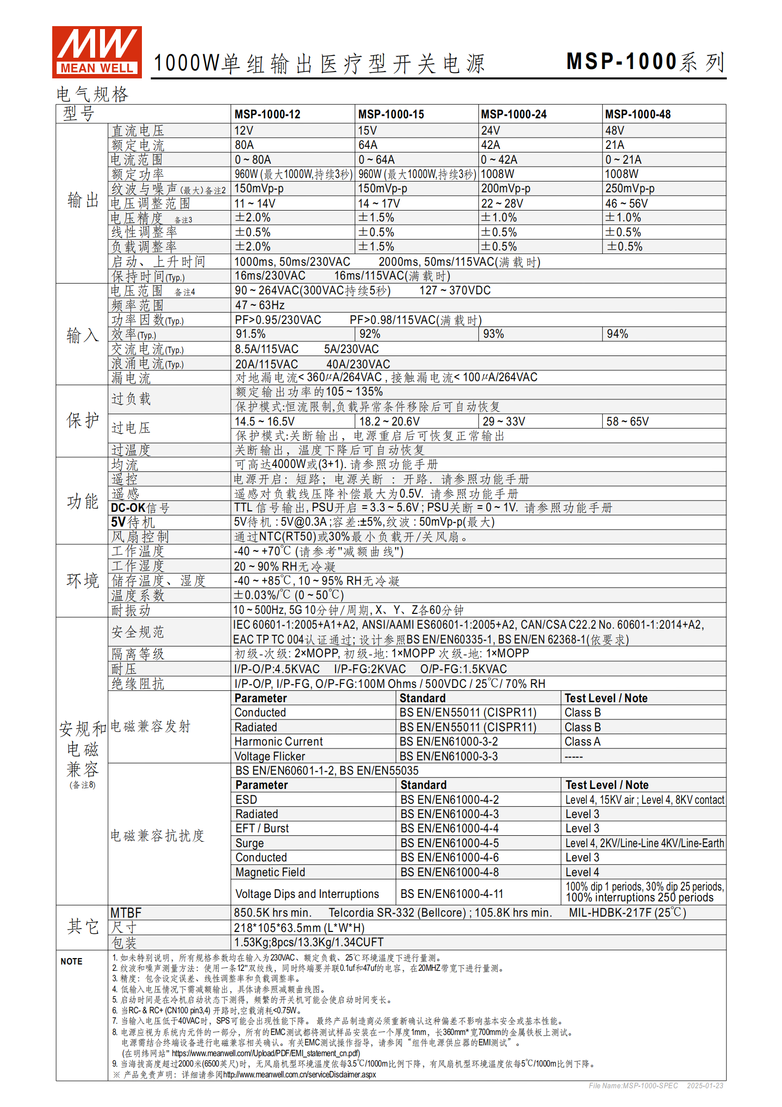 產(chǎn)品名稱:明緯 MSP-1000 系列 1000W 單組輸出醫(yī)療型開關(guān)電源