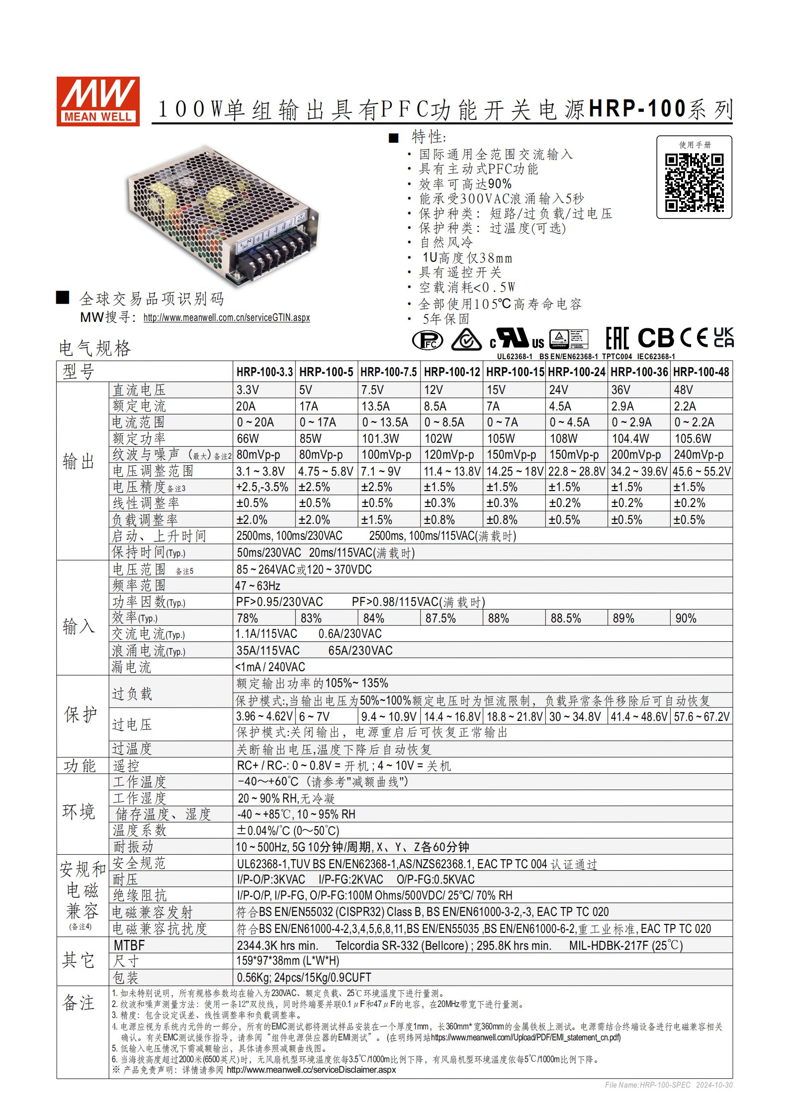 型號系列:HRP-100-3.3、-5、-7.5、-12、-15、-24、-36、-48