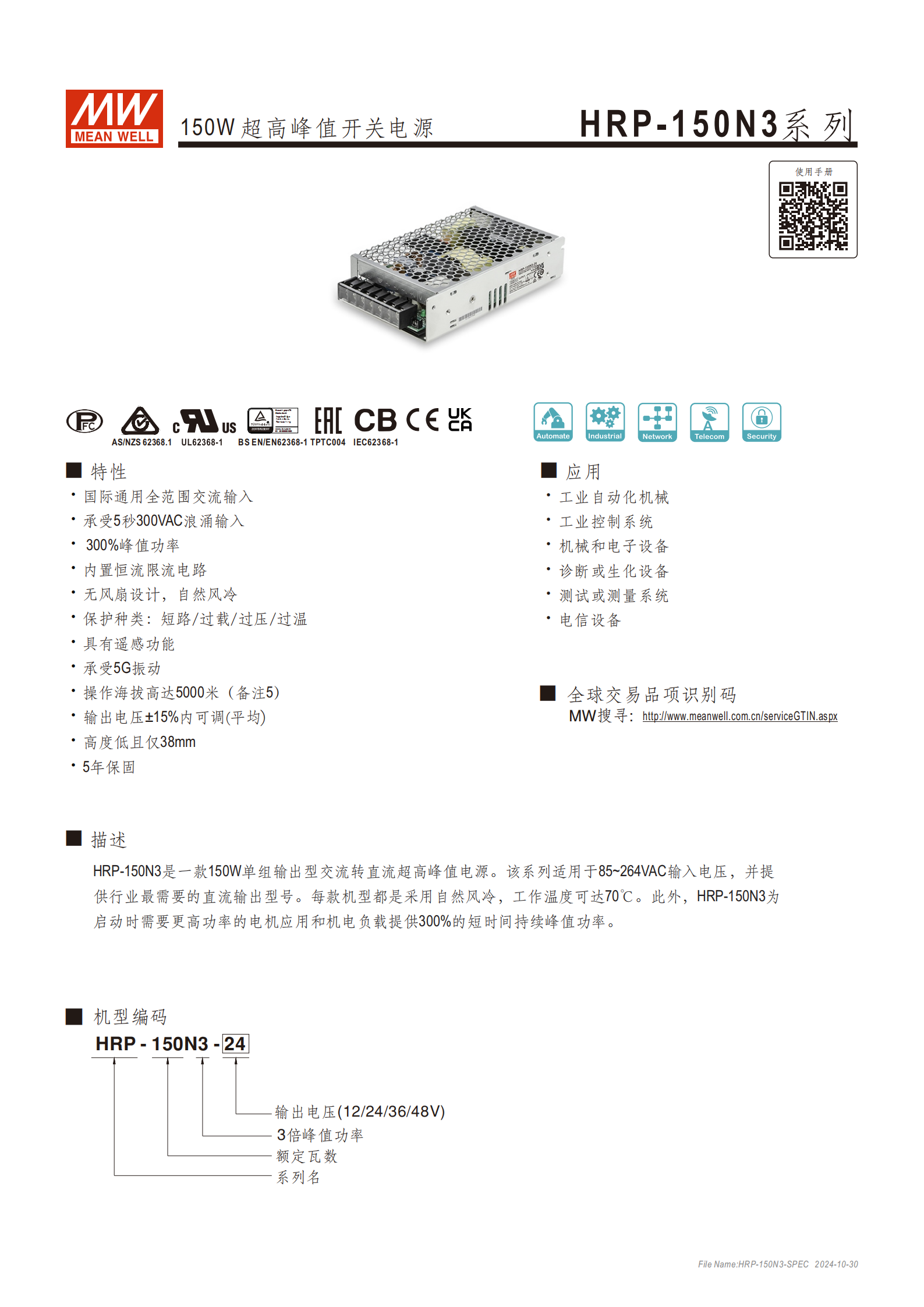 | HRP-150N3-24 | 24V | 6.5A | 156W | 150mVp-p | 21.6~28.8V |