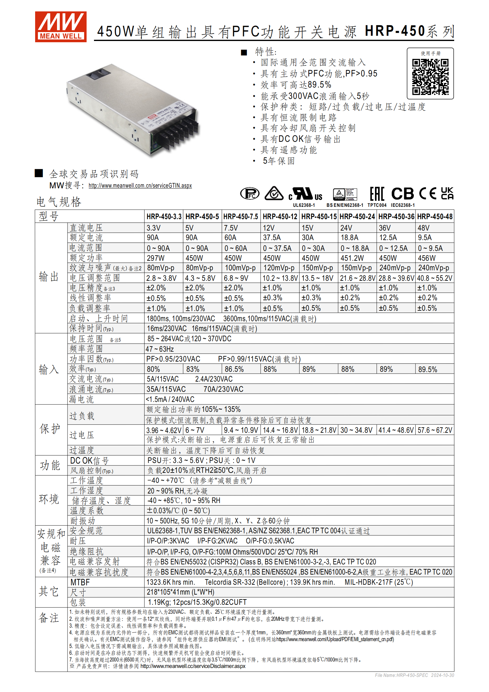 HRP-450 系列是450W 單組輸出的開關(guān)電源,核心亮點為具備主動式 PFC 功能(PF>0.95/230VAC、PF>0.99/115VAC 滿載時) ,效率最高可達(dá)89.5% ,能承受 300VAC 浪涌輸入 5 秒,產(chǎn)品符合 UL62368-1、IEC62368-1 等多項國際安規(guī)標(biāo)準(zhǔn),提供5 年保固,機(jī)身尺寸為 21810541mm(LWH),包裝規(guī)格為 12pcs/15.3Kg/0.82CUFT,凈重 1.19Kg。