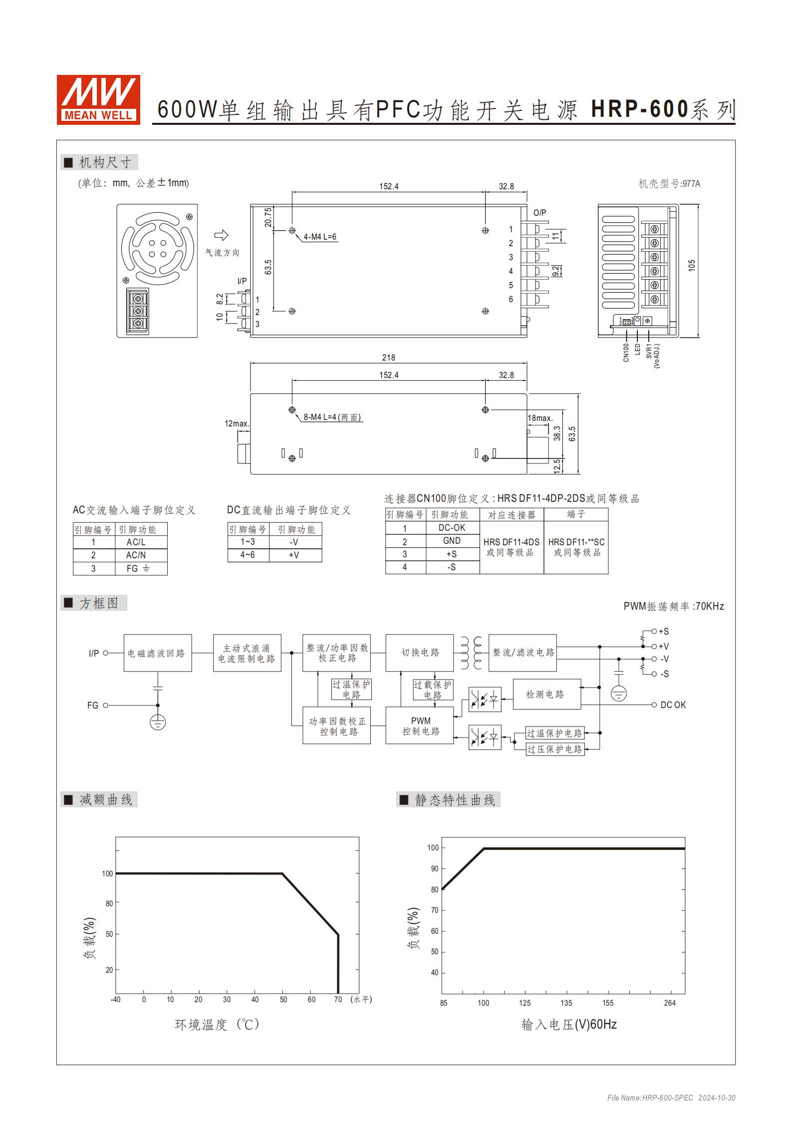 端子定義:AC 輸入(1=AC/L、2=AC/N、3=FG);DC 輸出(1~3=-V、4~6=+V);CN100 連接器(1=DC-OK、2=GND、3=+S、4=-S)