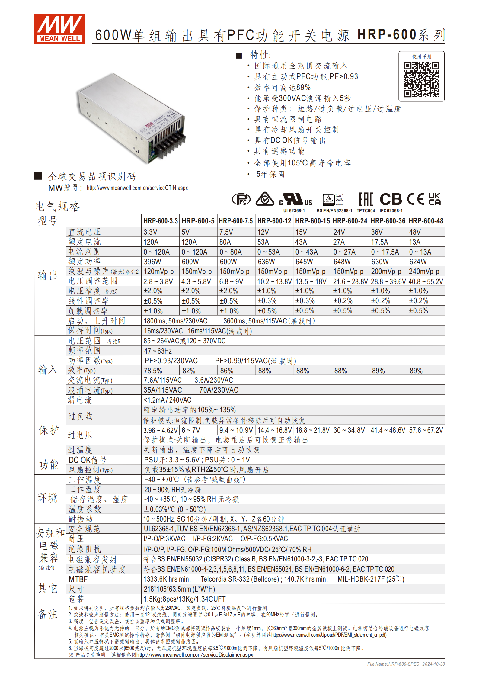 問題 1:HRP-600 系列開關電源的核心優(yōu)勢的是什么?不同輸出電壓型號的效率差異如何?