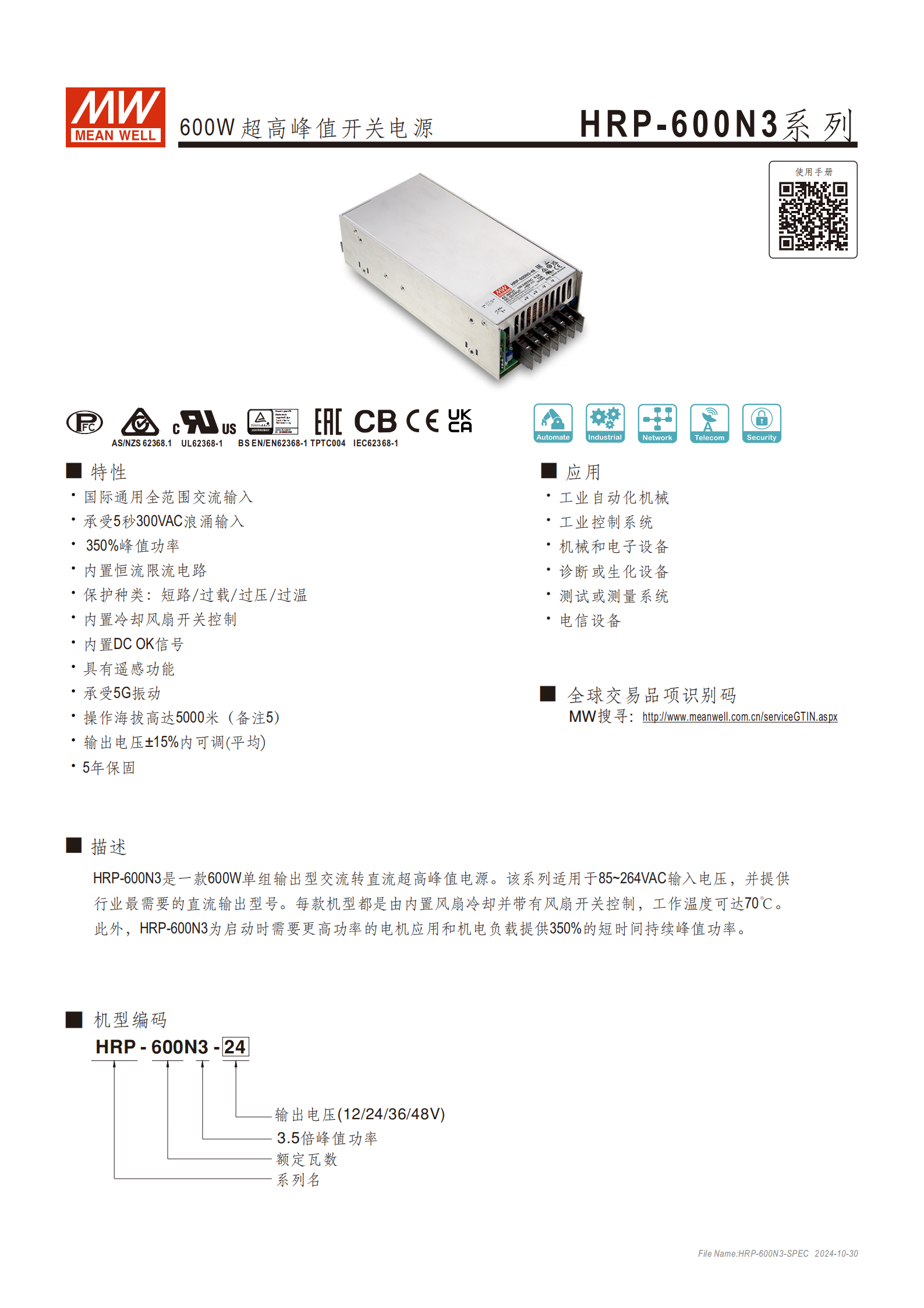 HRP-600N3 系列是一款600W 單組輸出超高峰值開關電源,支持85~264VAC 全范圍交流輸入,提供 12V/24V/36V/48V 四種直流輸出型號,具備350% 峰值功率(適配電機等啟動高功率需求場景),內(nèi)置恒流限流、短路 / 過載 / 過壓 / 過溫等多重保護,支持風扇控制、DC OK 信號、遙感功能,工作溫度范圍 **-40~+70℃,操作海拔高達5000 米 **,通過多項國際安全認證,享有5 年保固,廣泛應用于工業(yè)自動化、測試測量系統(tǒng)等領域。