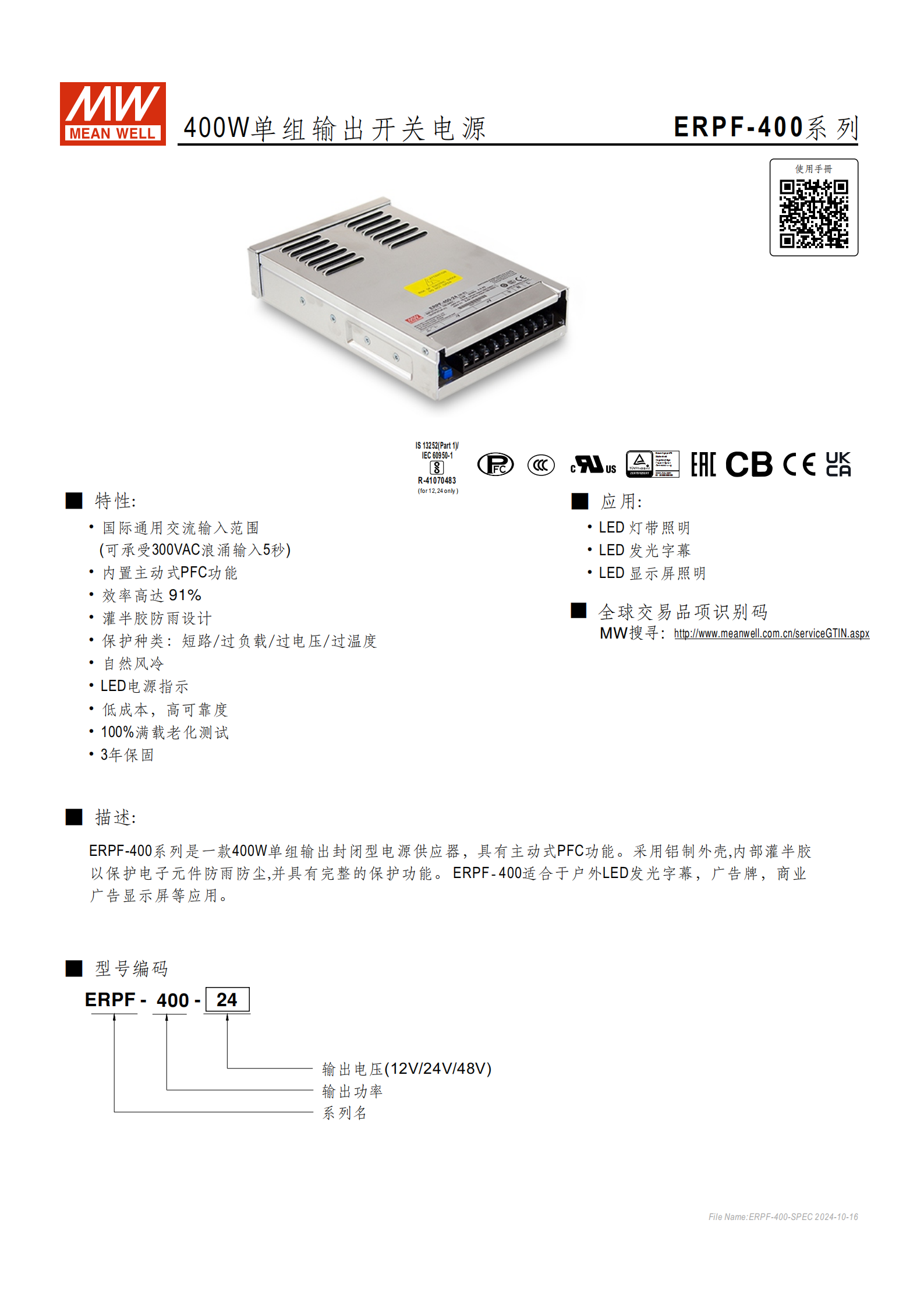 | ERPF-400-24 | 24V | 16.7A | 400.8W | 150mVp-p | 90% |