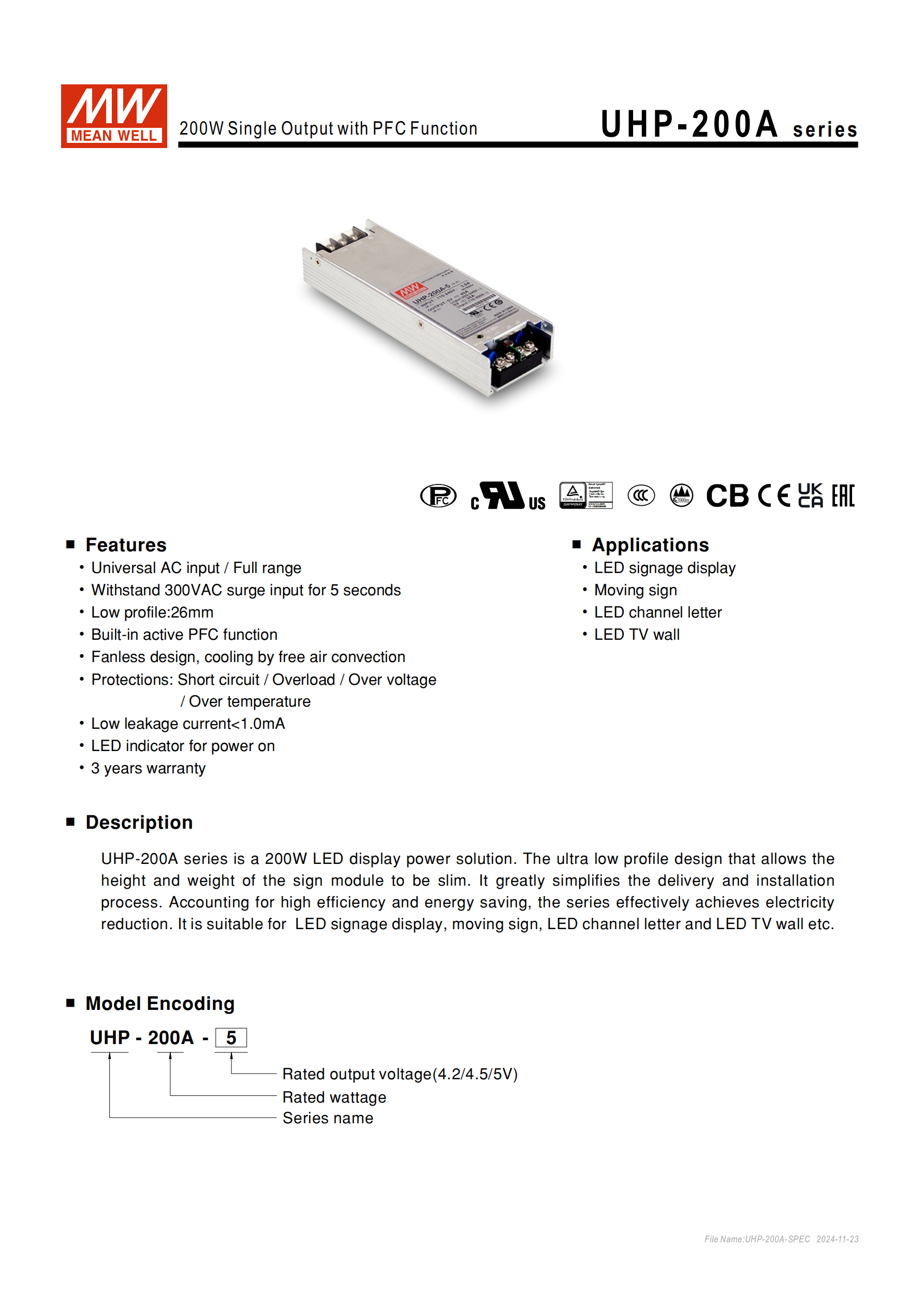 UHP-200A 系列是一款200W 單組輸出帶 PFC 功能的 LED 顯示屏驅(qū)動(dòng)電源,具備國(guó)際通用 90~264VAC 輸入、300VAC 浪涌輸入 5 秒承受能力、26mm 超低高度、無(wú)風(fēng)扇自然風(fēng)冷等特性,提供短路 / 過(guò)負(fù)載 / 過(guò)電壓 / 過(guò)溫度四重保護(hù),輸出電壓涵蓋 4.2V/4.5V/5V 三種規(guī)格,額定電流均為 40A,適用于 LED 電子指示牌、顯示屏等場(chǎng)景,通過(guò)多項(xiàng)安規(guī)認(rèn)證,享有 3 年保固。