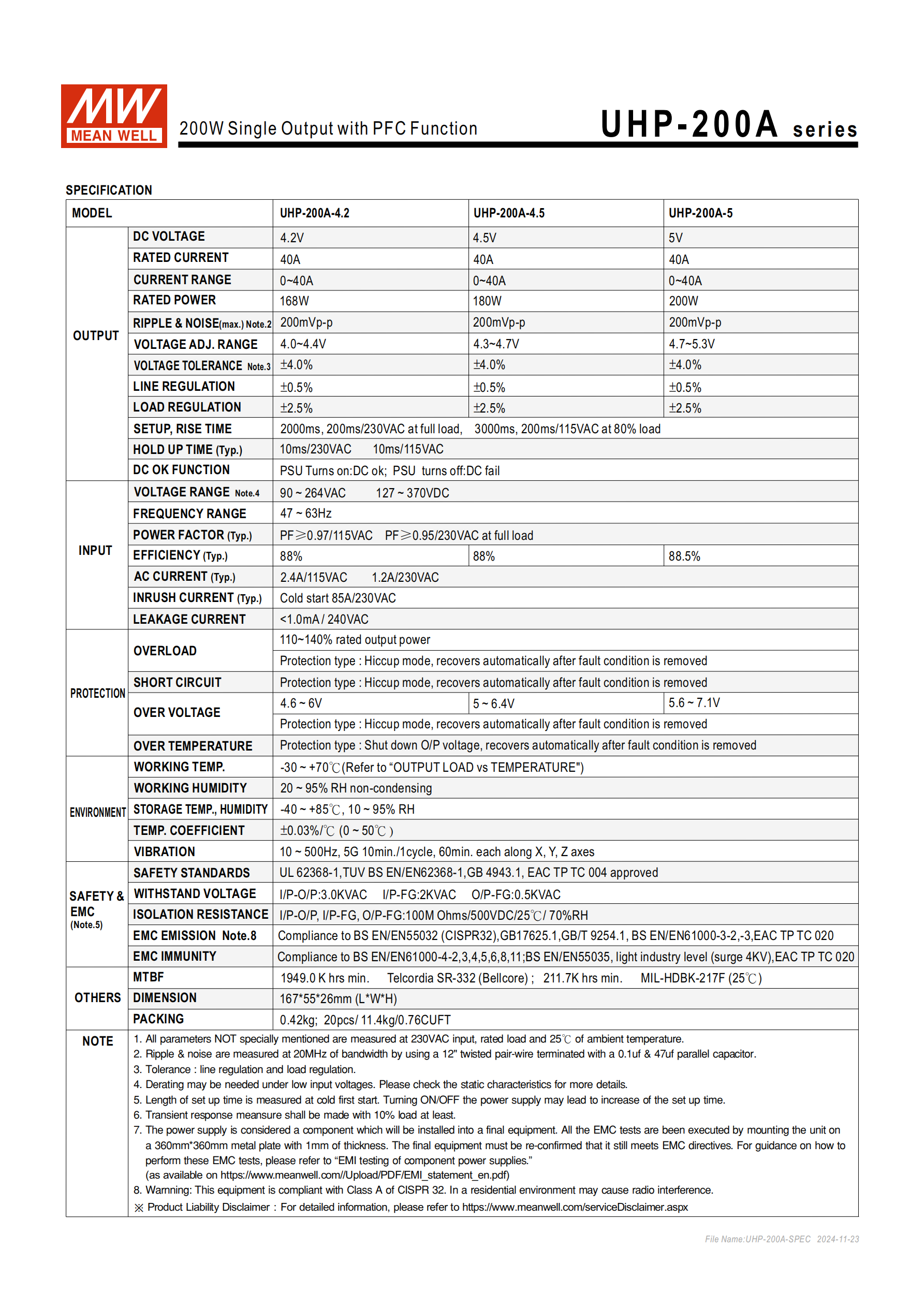 | UHP-200A-4.5 | 4.5V | 40A | 0~40A | 180W | 200mVp-p | 4.3~4.7V | ±0.5%(線性)、±2.5%(負(fù)載)、±4.0%(總精度) |