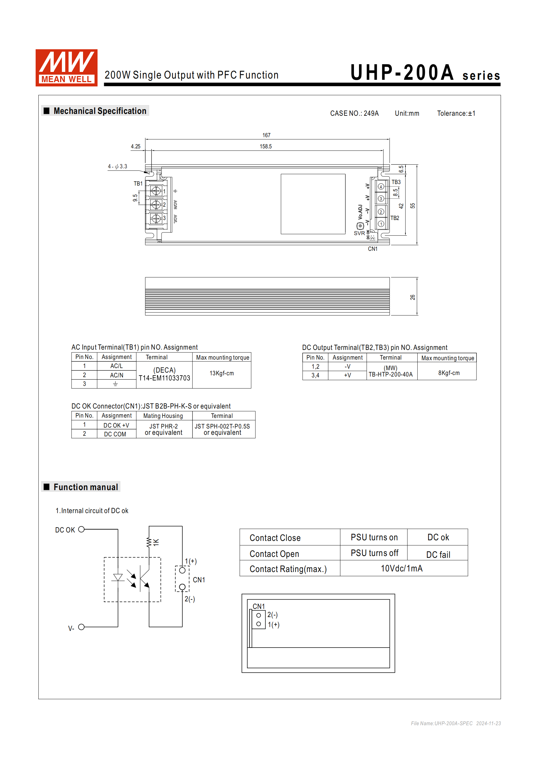 端子規(guī)格:交流輸入端子(TB1)、直流輸出端子(TB2/TB3)、DC OK 連接器(CN1)均有明確腳位定義和最大扭力要求