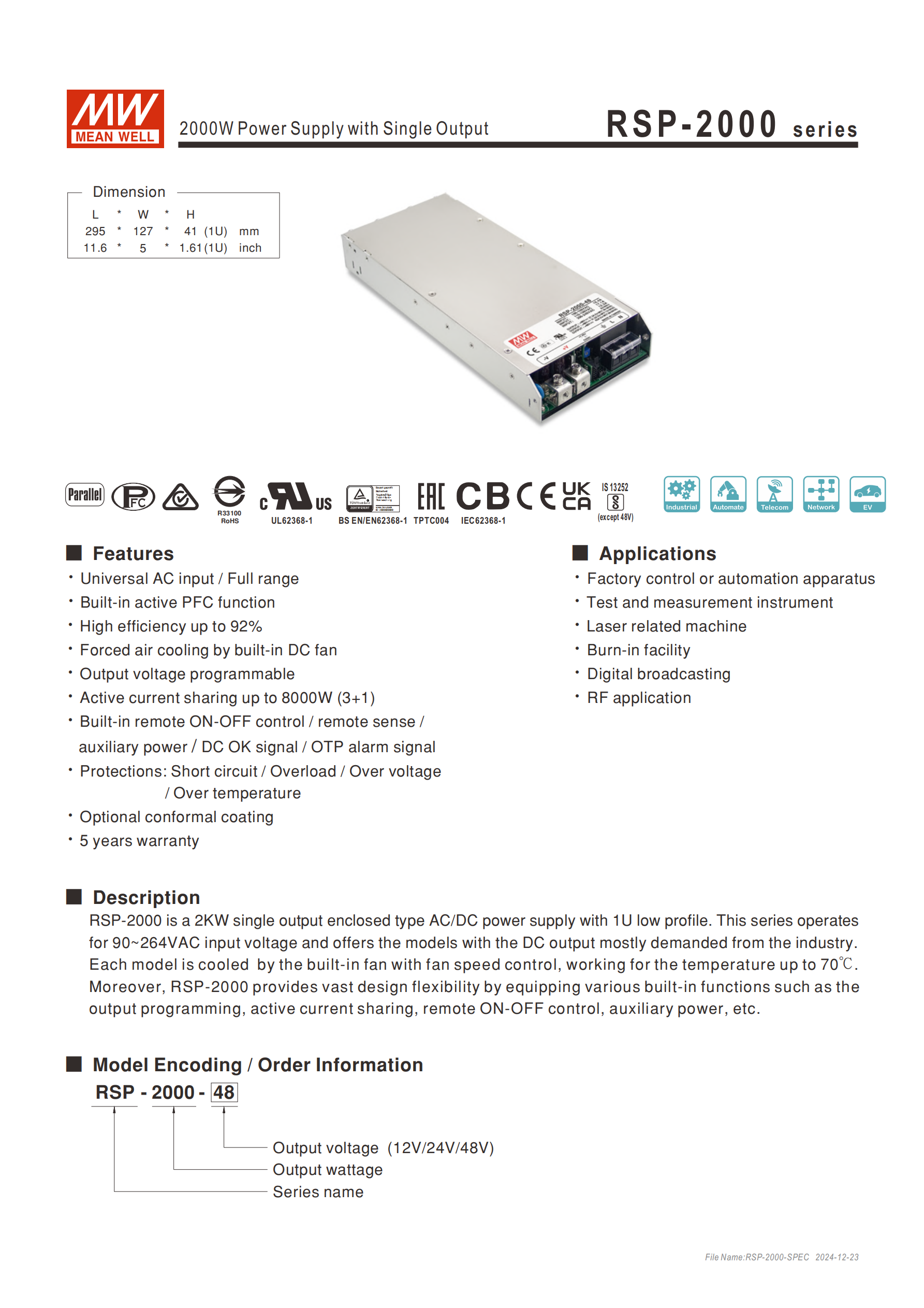RSP-2000 系列是 1U 低外型 2KW 單組輸出機殼型交流變直流電源供應器,支持 90~264VAC 全范圍交流輸入,內(nèi)建主動式 PFC 功能,效率高達 92%,輸出電壓涵蓋 12V、24V、48V 三種規(guī)格,額定功率分別為 1200W、1920W、2016W,具備輸出電壓可調(diào)、主動式并聯(lián)(3+1 可達 8000W)、遙控開關等多種功能,擁有短路 / 過負載 / 過電壓 / 過溫度等全面保護,工作溫度范圍 - 35~+70℃,通過多項國際安規(guī)認證,提供 5 年保固,廣泛應用于工業(yè)控制、測試測量儀器等領域。