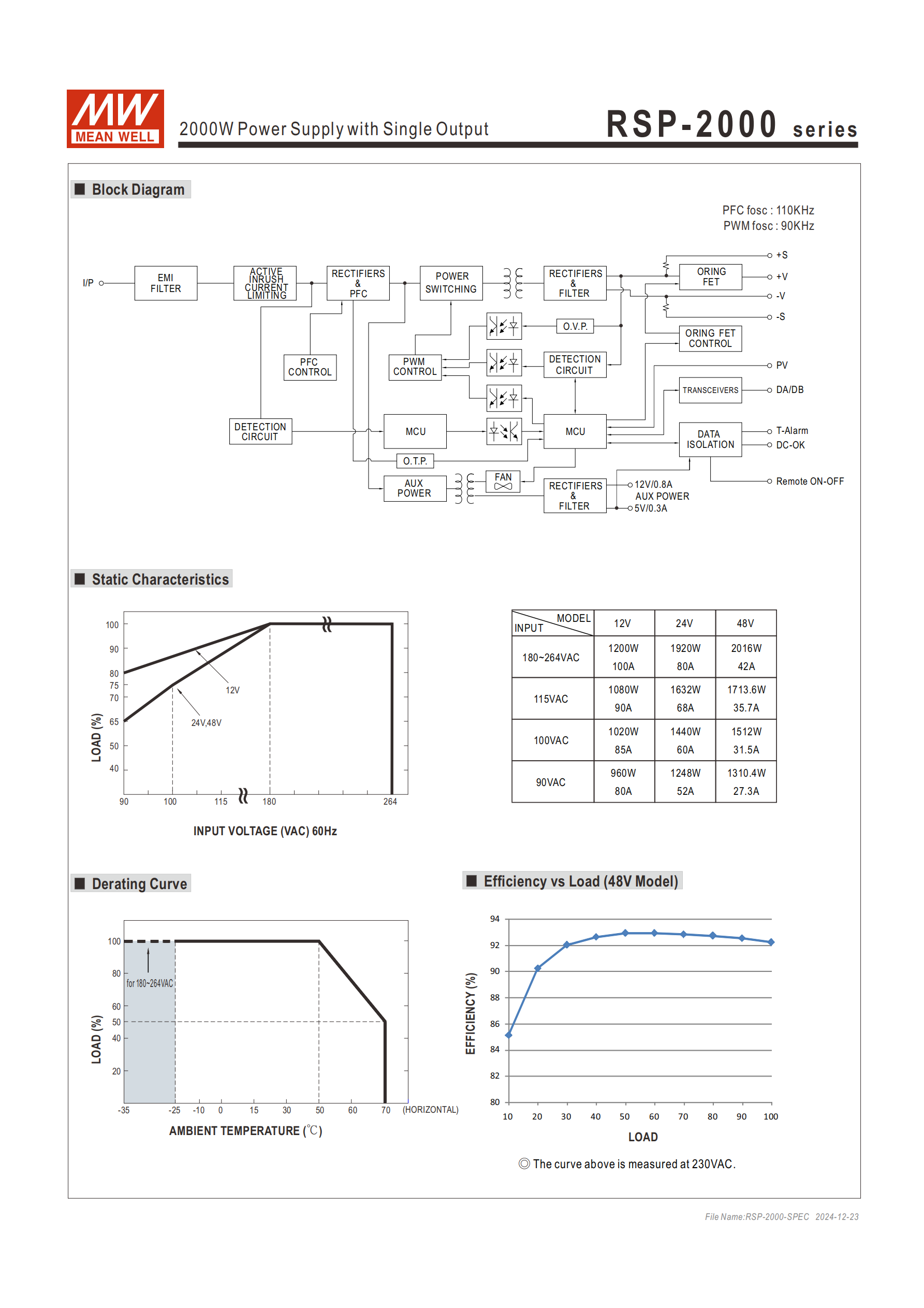 效率:Typ. 最高92%(RSP-2000-12),其余機型分別為 87%(24V)、90.5%(48V)