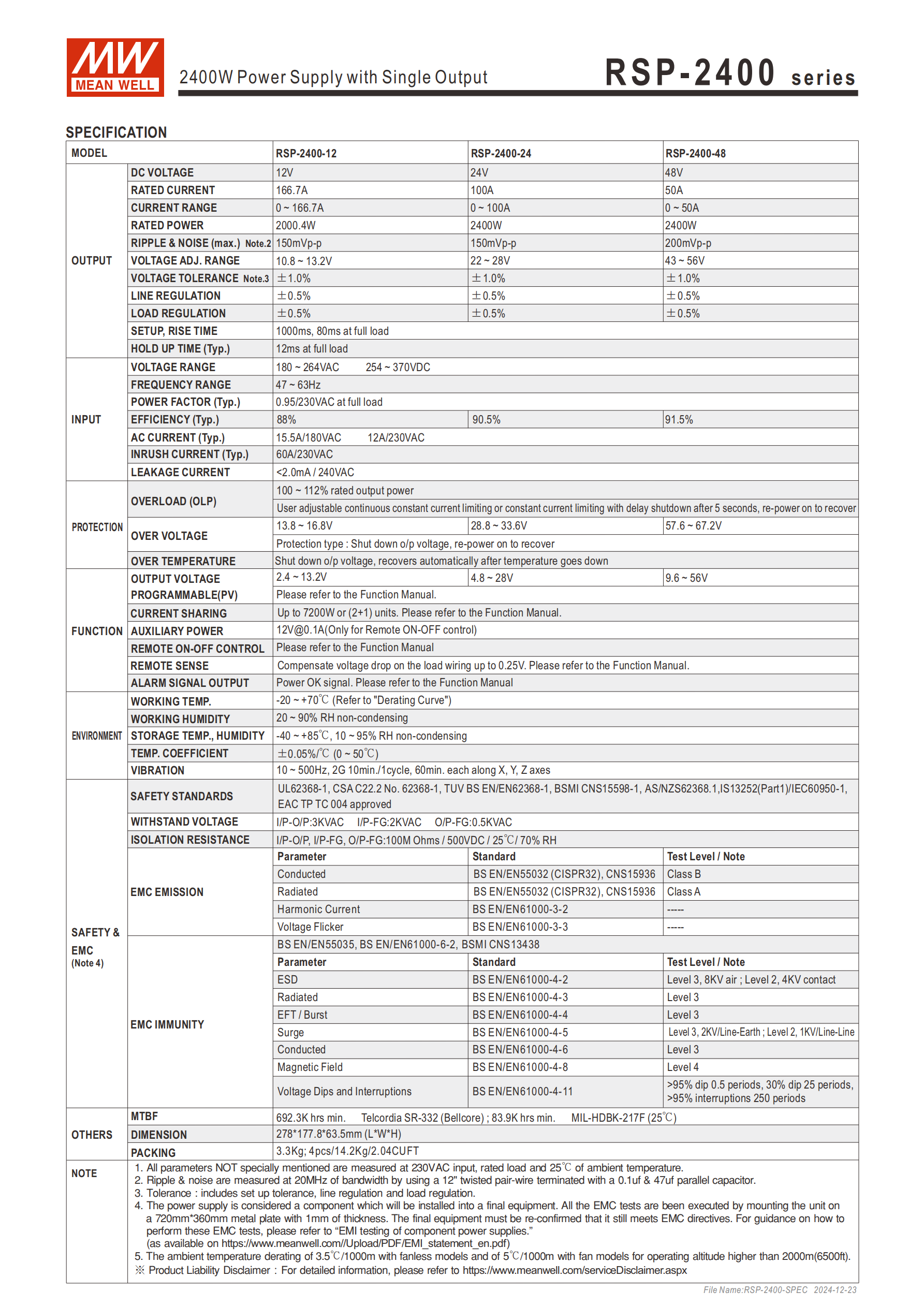| RSP-2400-12 | 12V | 10.8~13.2V(PV:2.4~13.2V) | 166.7A | 2000.4W |