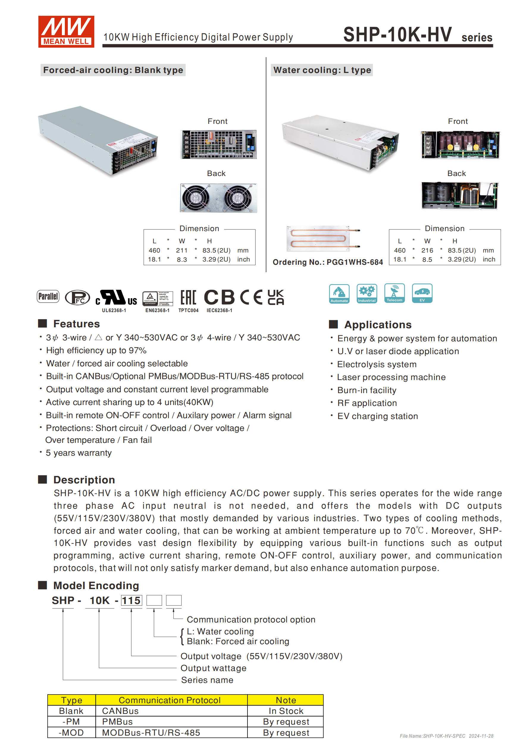 SHP-10K-HV 系列是一款 10KW 高效率 AC/DC 數(shù)位電源,支持 3 相 3 線 /△或 Y、3 相 4 線 / Y 的 340~530VAC 寬范圍輸入,提供 55V/115V/230V/380V 多種直流輸出,效率高達(dá) 97%,具備強(qiáng)制風(fēng)冷(Blank 類型)和水冷(L 類型)兩種冷卻方式,最高工作溫度 70℃;內(nèi)置 CANBus 通訊協(xié)議,可選 PMBus/MODBus-RTU/RS-485,支持輸出電壓(50~120% 額定值)和恒流值(20~100% 額定值)可編程,最多 4 臺并聯(lián)實(shí)現(xiàn) 40KW 輸出,配備短路 / 過負(fù)載等多重保護(hù),適用于自動化能源電力系統(tǒng)、鐳射加工機(jī)等多領(lǐng)域,享有 5 年保固。