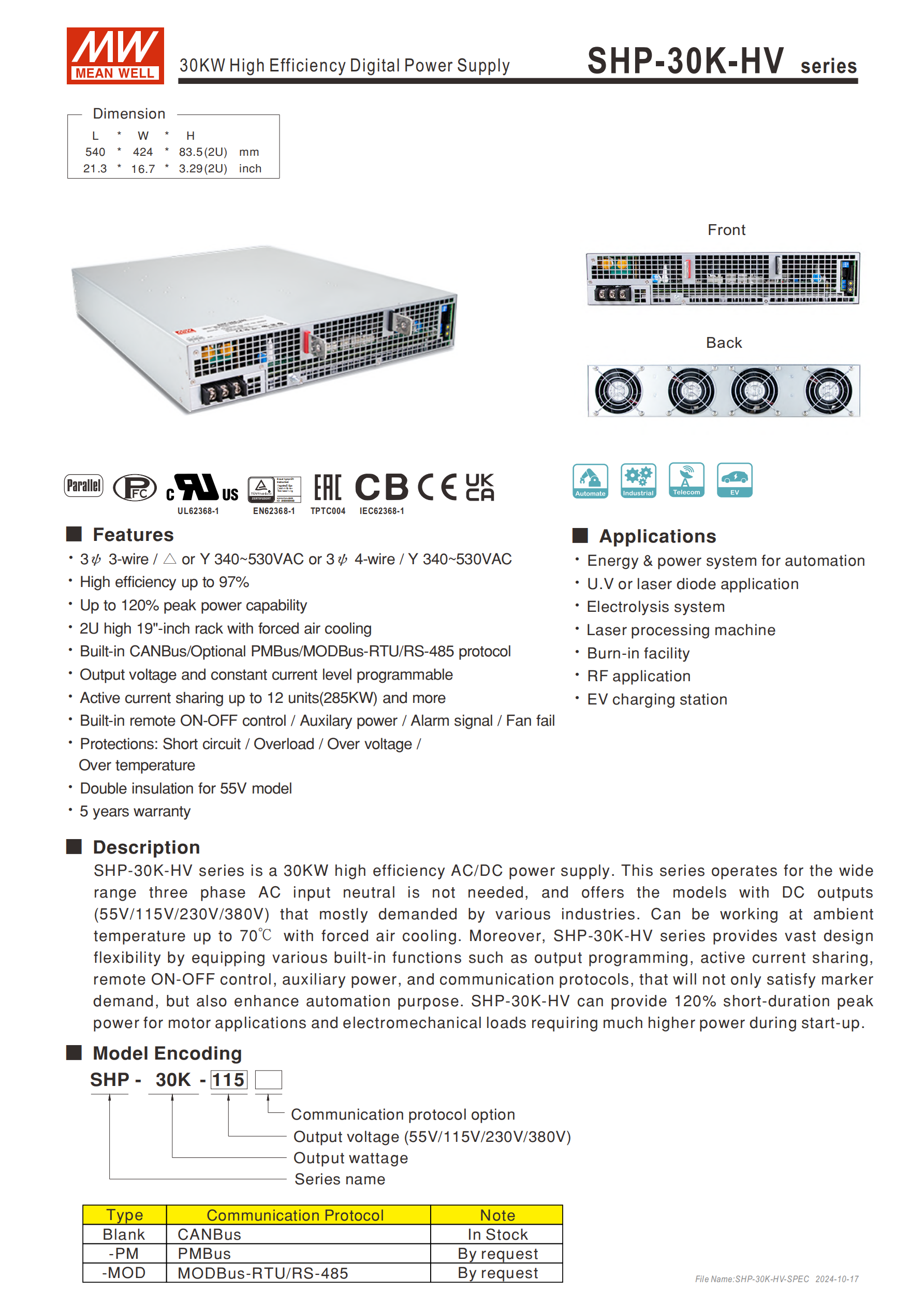 SHP-30K-HV 系列是30KW 高效率 AC/DC 數(shù)位電源,支持3 相 3 線 /△或 Y、3 相 4 線 / Y 340~530VAC 寬輸入,輸出電壓涵蓋55V/115V/230V/380V,效率高達97% ,具備120% 峰值功率(持續(xù)≤5 秒)、主動式并聯(lián)(最多 12 臺,達 285KW) 等核心特性,內(nèi)建 CANBus 通訊(可選 PMBus/MODBus-RTU/RS-485),支持輸出電壓 / 恒流可編程調(diào)整,擁有短路 / 過負載等多重保護,適配自動化能源系統(tǒng)、鐳射加工機等多場景,2U 高 19 吋機箱強制風冷,工作溫度范圍 **-30~+70℃** ,提供5 年保固。