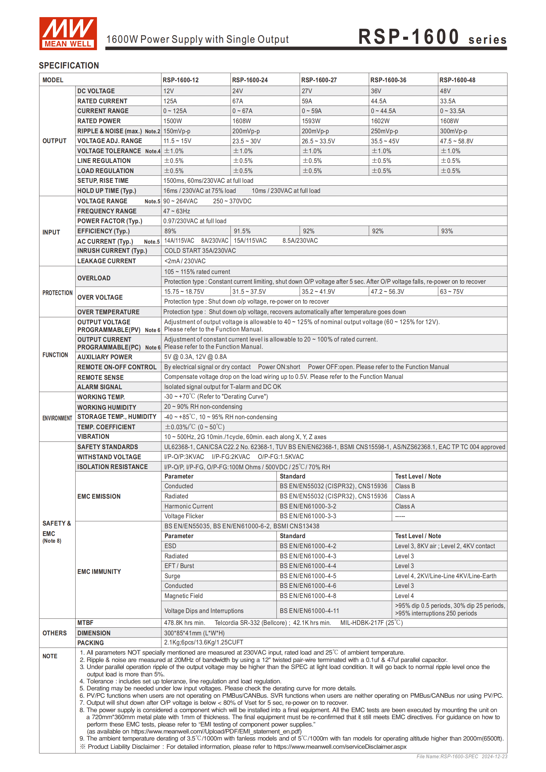 | RSP-1600-12 | 12V | 125A | 1500W | 11.5~15V | 150mVp-p |