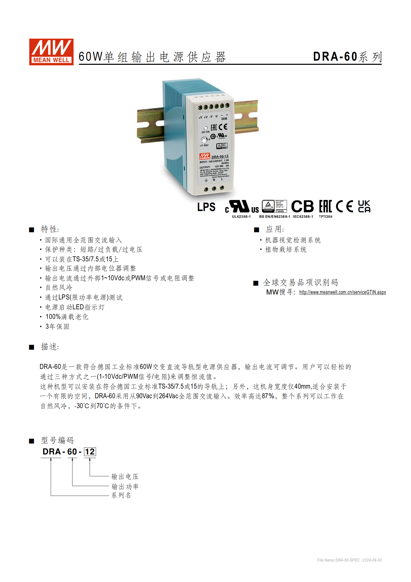 DRA-60 系列是明緯推出的60W 單組輸出導(dǎo)軌型電源供應(yīng)器,具備90-264Vac 全范圍交流輸入,輸出電壓(12V/24V 兩種型號)可通過內(nèi)部電位器調(diào)整,輸出電流能通過 1~10Vdc、PWM 信號或電阻三種方式調(diào)節(jié),支持安裝在 TS-35/7.5 或 15 導(dǎo)軌上,機身寬度僅 40mm,工作溫度范圍為 **-30~+70℃**,效率高達 87%,通過多項國際安規(guī)認(rèn)證,提供 3 年保固,適用于機器視覺檢測系統(tǒng)、植物栽培系統(tǒng)等場景。