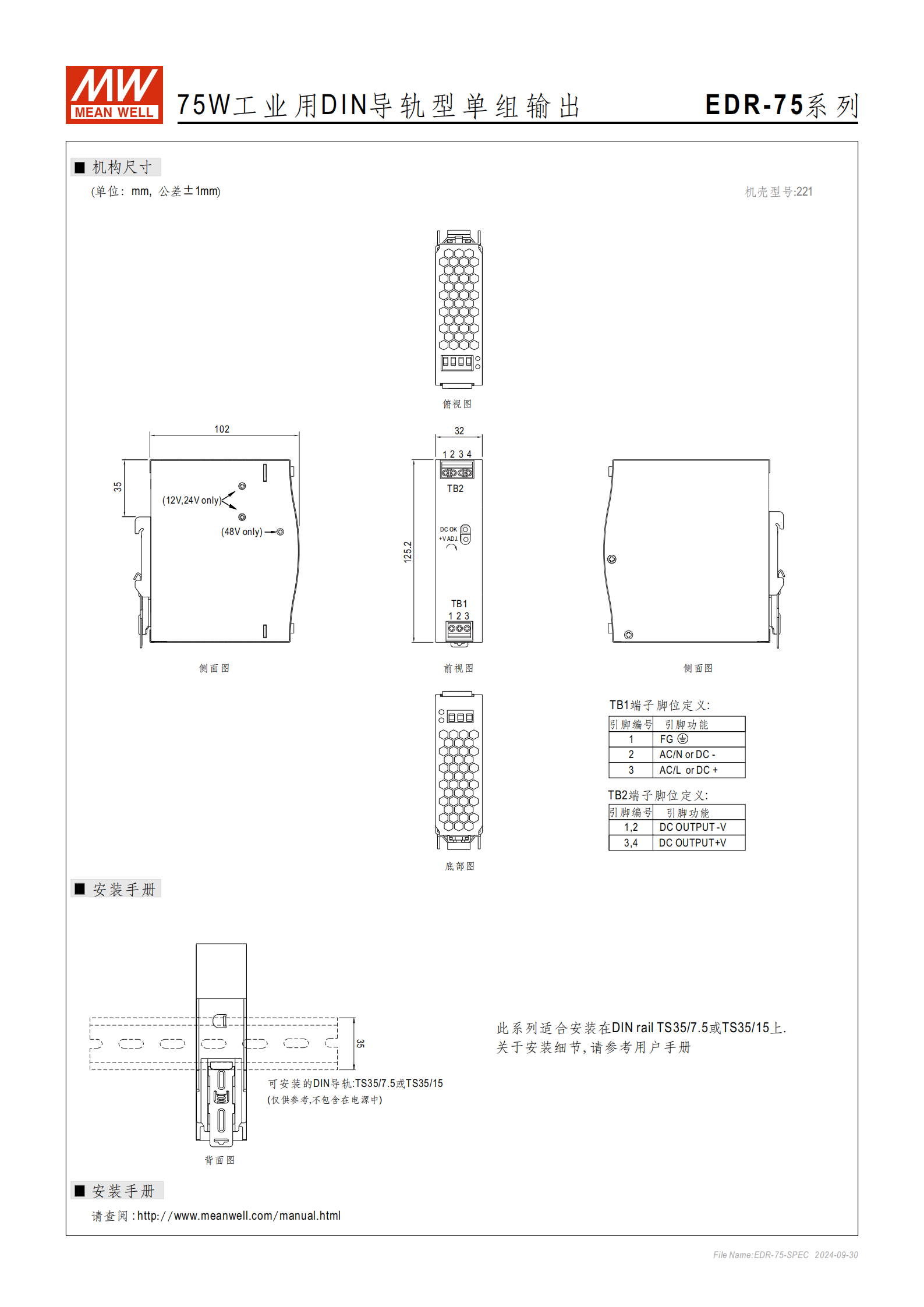 產品名稱:EDR-75 系列 75W 工業(yè)用 DIN 導軌型單組輸出電源供應器