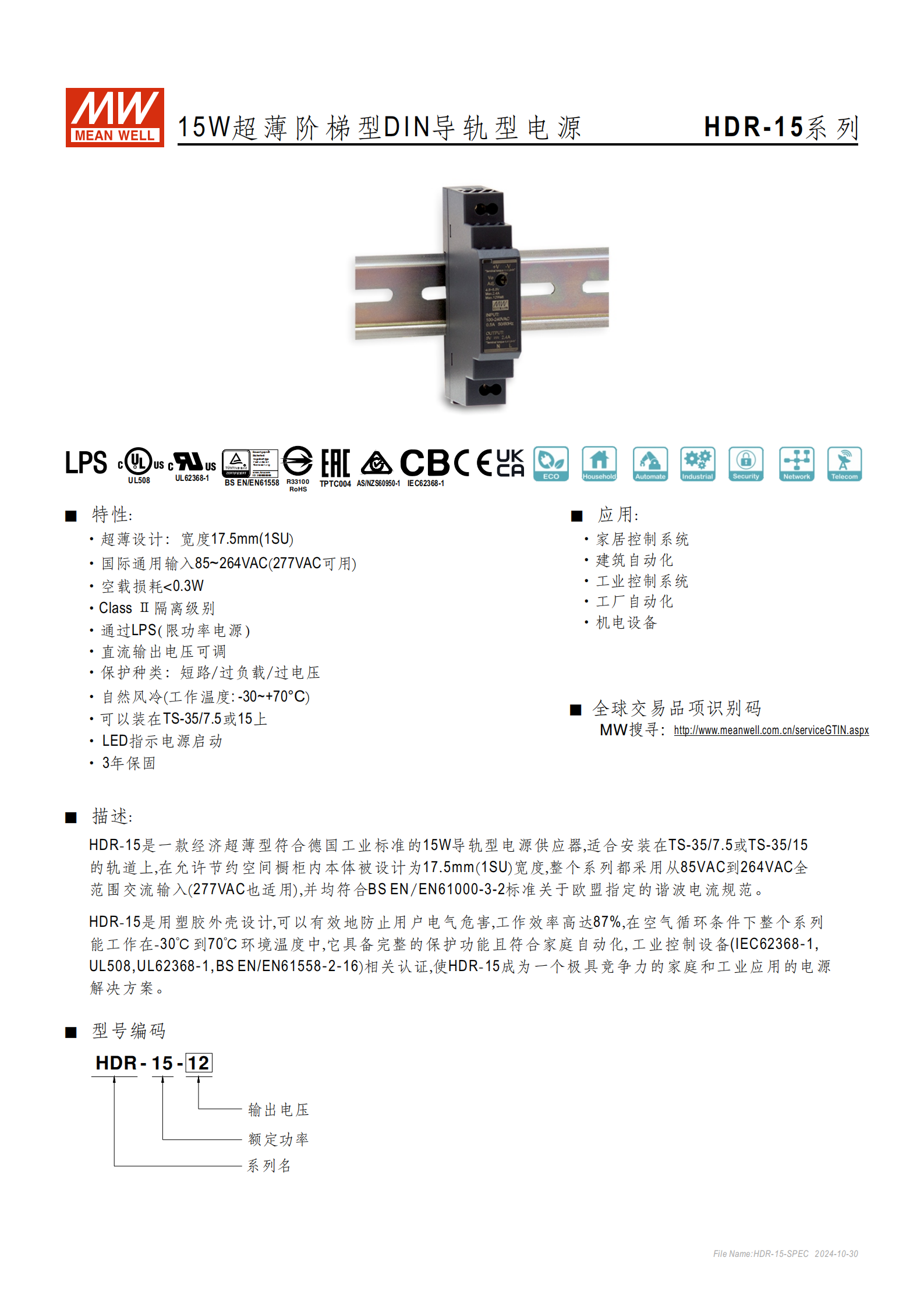 品牌與系列:MEAN WELL(明緯)HDR-15 系列,定位經(jīng)濟(jì)超薄型 DIN 導(dǎo)軌型電源供應(yīng)器