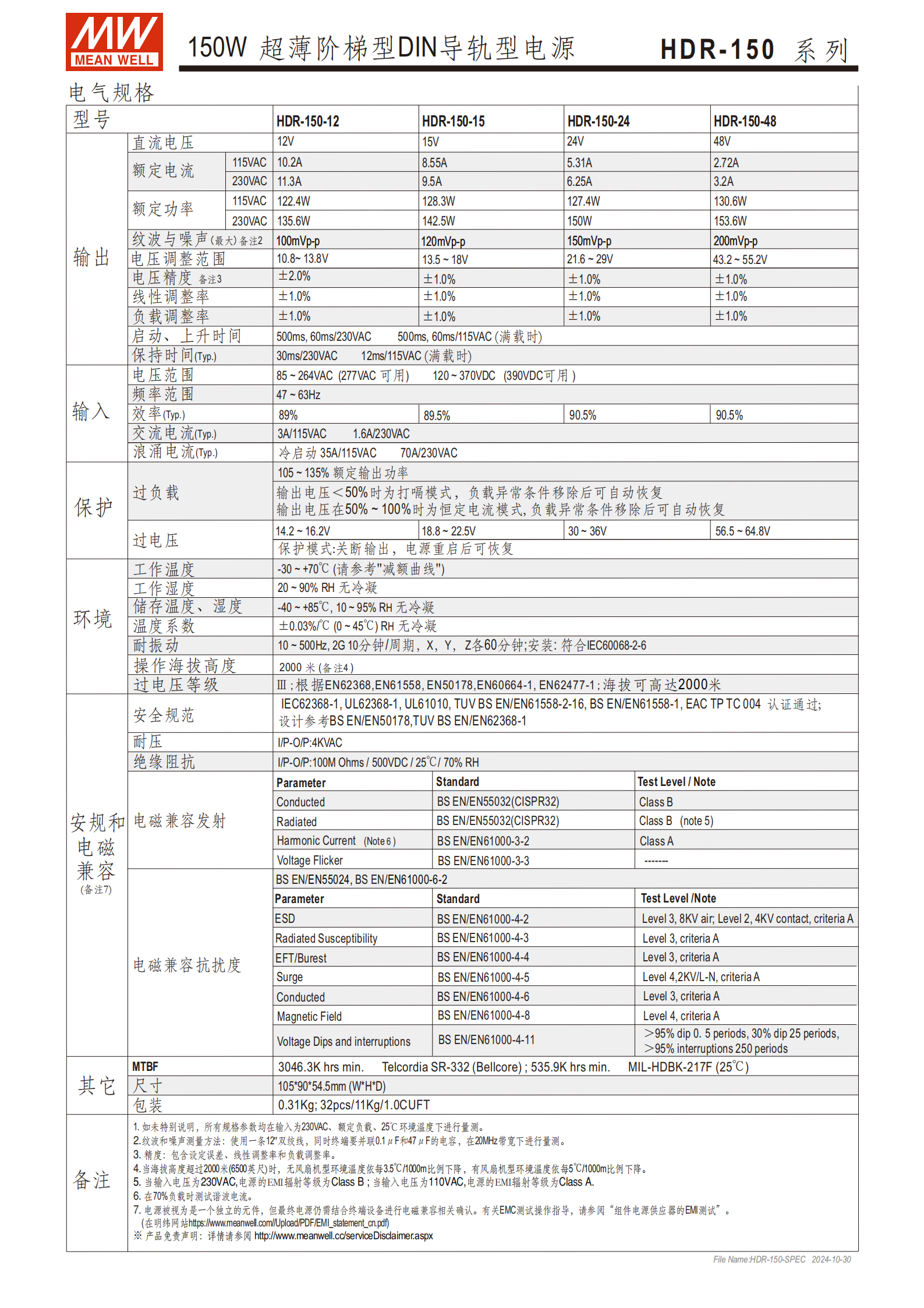 問題 2:HDR-150 系列電源的輸入輸出關(guān)鍵參數(shù)有哪些,核心保護(hù)功能是什么?