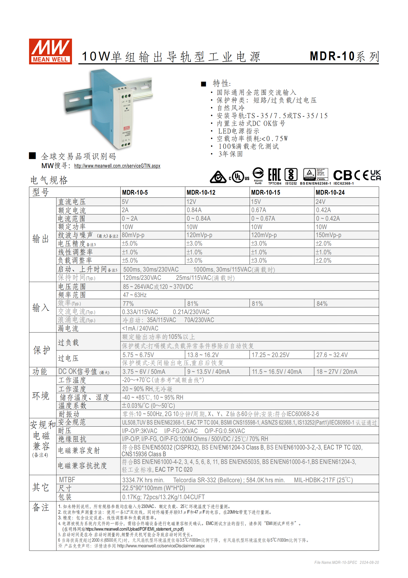 MDR-10 系列是10W 單組輸出導(dǎo)軌型工業(yè)電源,支持85~264VAC 或 120~370VDC 國際通用全范圍輸入,提供 5V/2A、12V/0.84A、15V/0.67A、24V/0.42A 四種輸出規(guī)格,具備短路 / 過負(fù)載 / 過電壓三重保護(hù),內(nèi)置主動(dòng)式 DC OK 信號(hào)與 LED 指示,空載功率損耗 < 0.75W,工作溫度范圍 - 20~+70℃,通過多項(xiàng)國際安規(guī)認(rèn)證,采用 TS-35/7.5 或 TS-35/15 導(dǎo)軌安裝,享有3 年保固,適用于工業(yè)控制等場景。