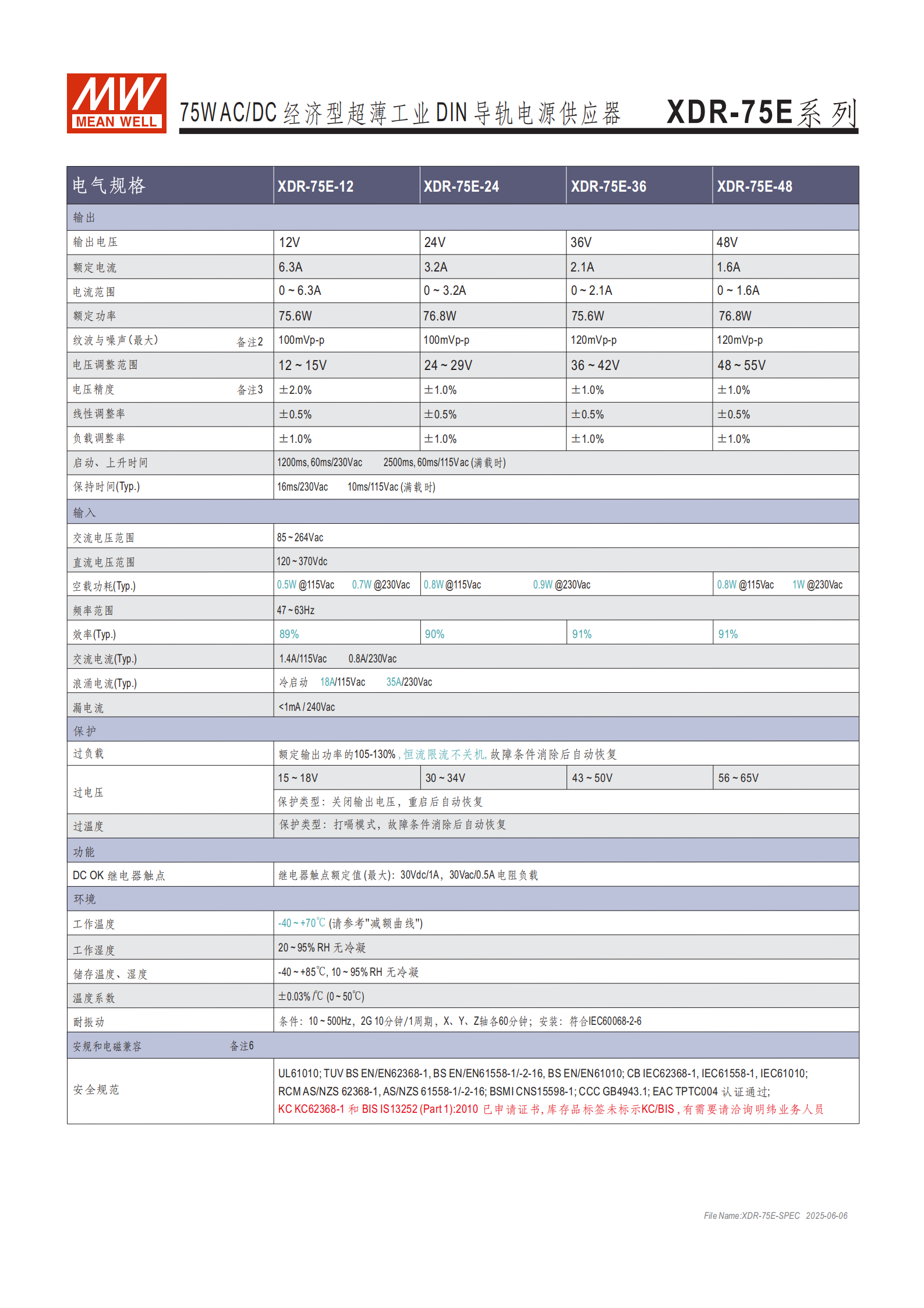 | XDR-75E-12 | 12V | 6.3A | 75.6W | 12~15V | ±2.0% |