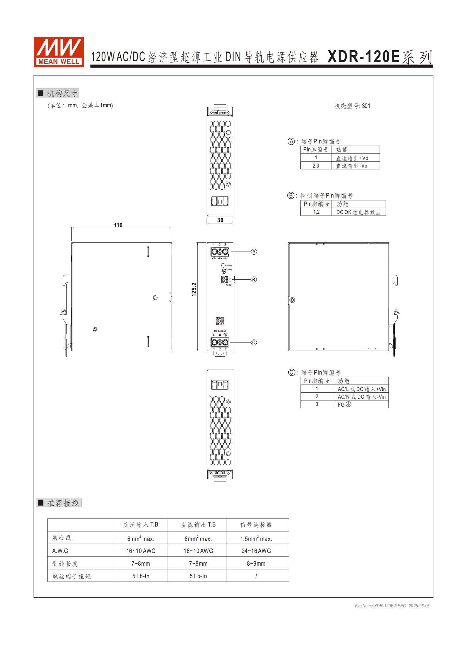 XDR-120E 系列是120W AC/DC 經(jīng)濟(jì)型超薄工業(yè) DIN 導(dǎo)軌電源供應(yīng)器,具備30mm 超薄寬度、85~264Vac 超寬輸入、91% 最高效率及0.6W~1W 空載功耗,輸出電壓涵蓋 12V/24V/36V/48V,支持 **-40~+70℃寬工作溫度范圍 **(+50℃滿載需減額),擁有短路 / 過載 / 過壓 / 過溫全面保護(hù)、OVC Ⅲ 過壓類別及 DC OK 繼電器觸點功能,通過全球多領(lǐng)域安規(guī)認(rèn)證,可安裝于 TS-35/7.5 或 15 DIN 導(dǎo)軌,提供3 年保固,廣泛應(yīng)用于工業(yè)控制系統(tǒng)、工廠自動化等場景。