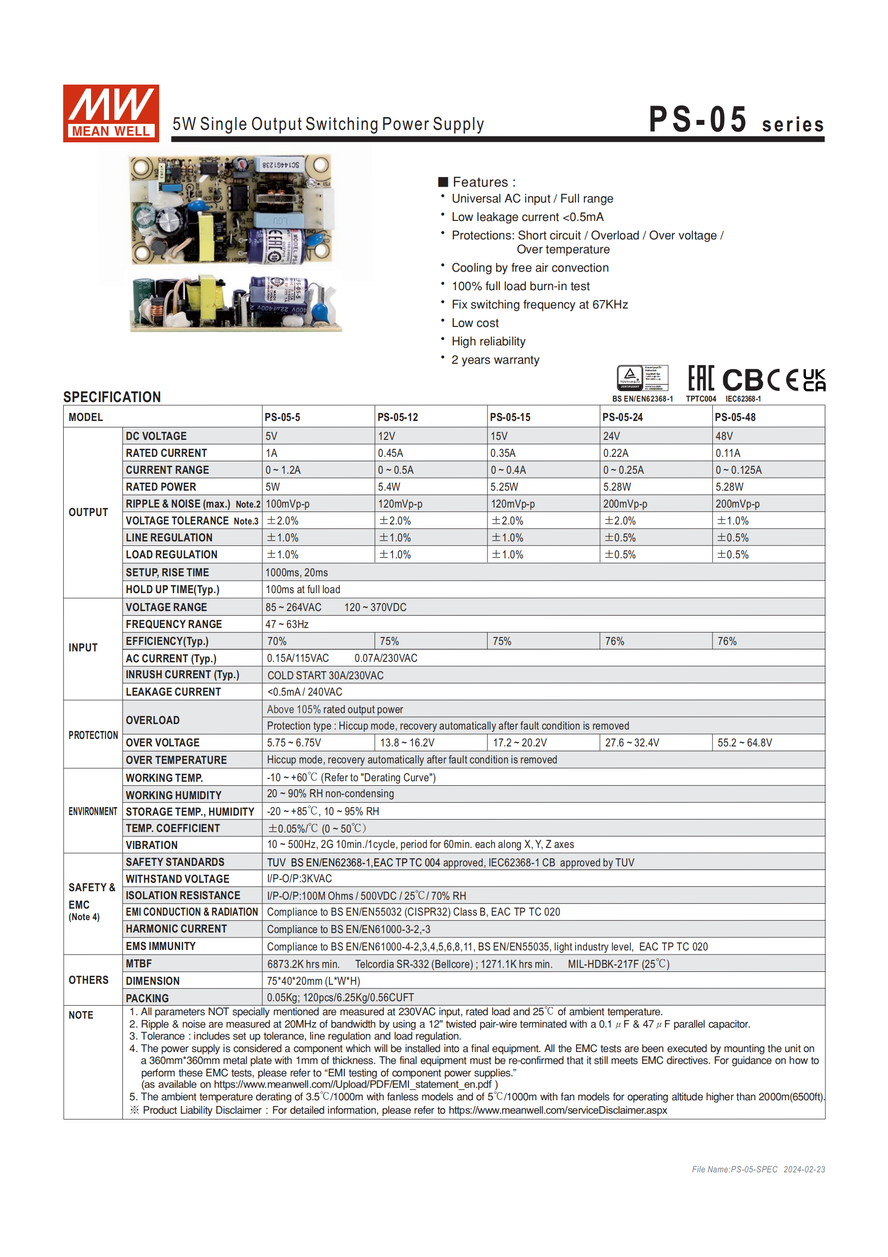 | PS-05-12 | 12V | 0.45A | 0~0.5A | 5.4W | 120mVp-p | ±2.0% | ±1.0% | ±1.0% |