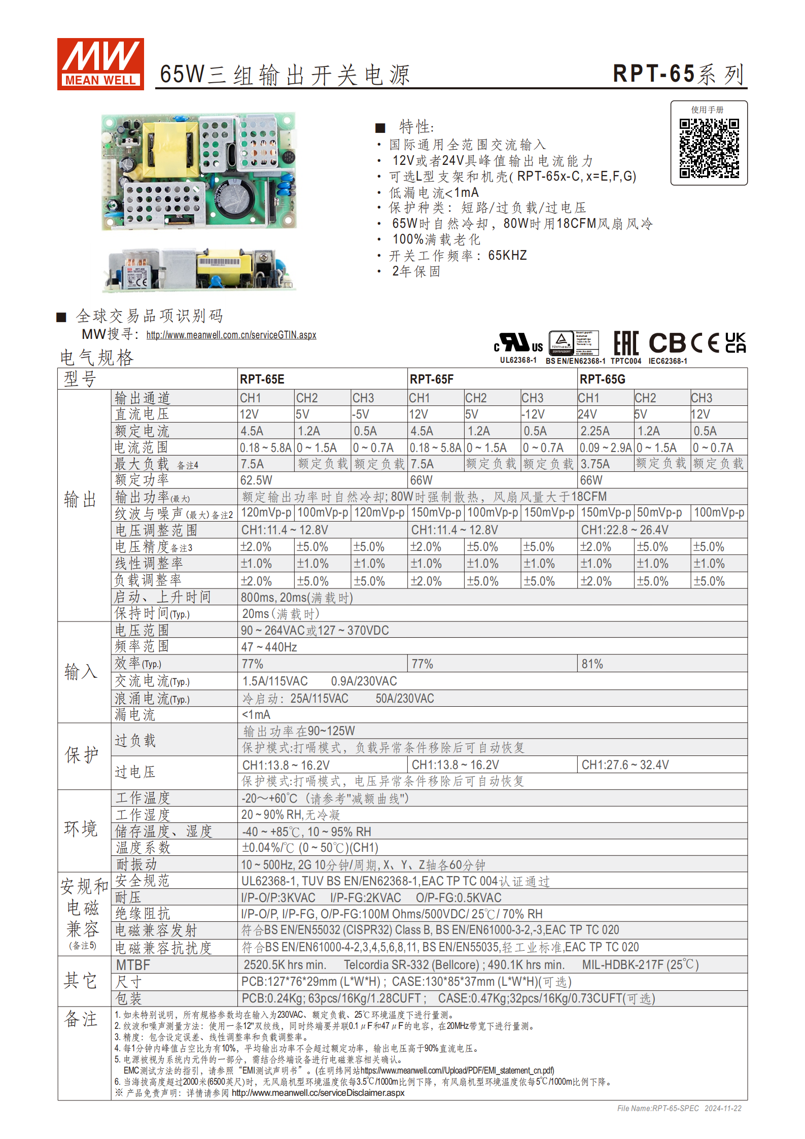RPT-65 系列65W 三組輸出開關(guān)電源(含 RPT-65E/F/G 型號),具備國際通用全范圍交流 / 直流輸入(90~264VAC 或 127~370VDC),三組輸出通道分別提供不同規(guī)格的直流電壓與電流(如 RPT-65E 為 12V/4.5A、5V/1.2A、-12V/0.5A),支持65W 自然冷卻、80W 強(qiáng)制風(fēng)冷,擁有短路 / 過負(fù)載 / 過電壓保護(hù)(打嗝模式,可自動恢復(fù))、低漏電流(<1mA)、65KHZ 開關(guān)頻率等特性,通過多項(xiàng)國際安全認(rèn)證,工作溫度范圍 - 20~+60℃,提供 2 年保固,可選 L 型支架和機(jī)殼,適用于多種需要多路直流供電的設(shè)備場景。