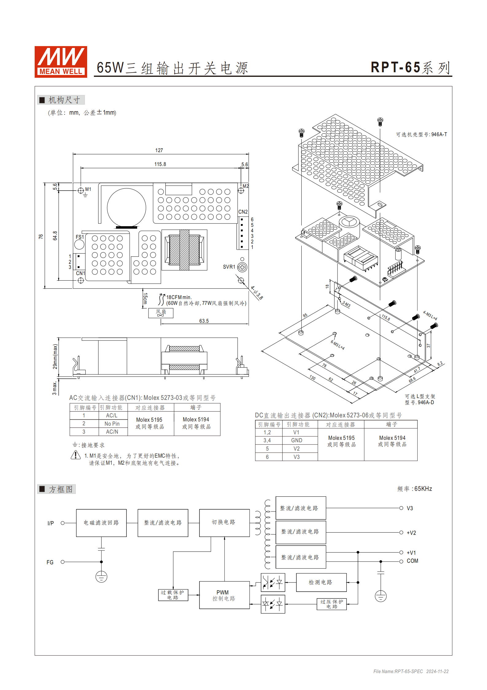 產(chǎn)品名稱:RPT-65 系列 65W 三組輸出開關(guān)電源