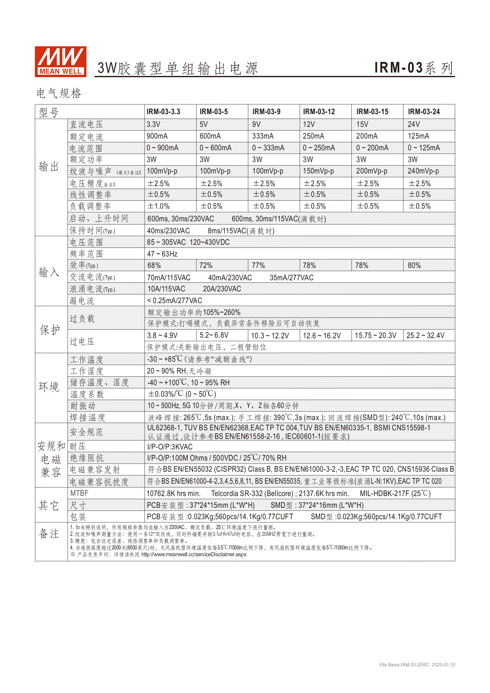 IRM-03 系列是 3W 膠囊型單組輸出 AC-DC 模塊電源,具備85~305VAC 全范圍交流輸入、≤0.075W 超低空載功耗、80% 最高效率,提供 3.3V~24V 多種輸出電壓選項(xiàng),采用阻燃塑膠機(jī)殼 + 硅膠填充設(shè)計(jì),滿足 5G 防振及基礎(chǔ)防塵防水需求,符合 ClassⅡ 隔離級別與 BS EN/EN55032 Class B 電磁兼容標(biāo)準(zhǔn),具備短路 / 過負(fù)載 / 過電壓保護(hù)功能,有 PCB 安裝型(372415mm)和 SMD 型(372416mm)兩種機(jī)型,適用于工業(yè)電氣、機(jī)械設(shè)備等場景,提供 3 年保固,信賴性高且成本低。