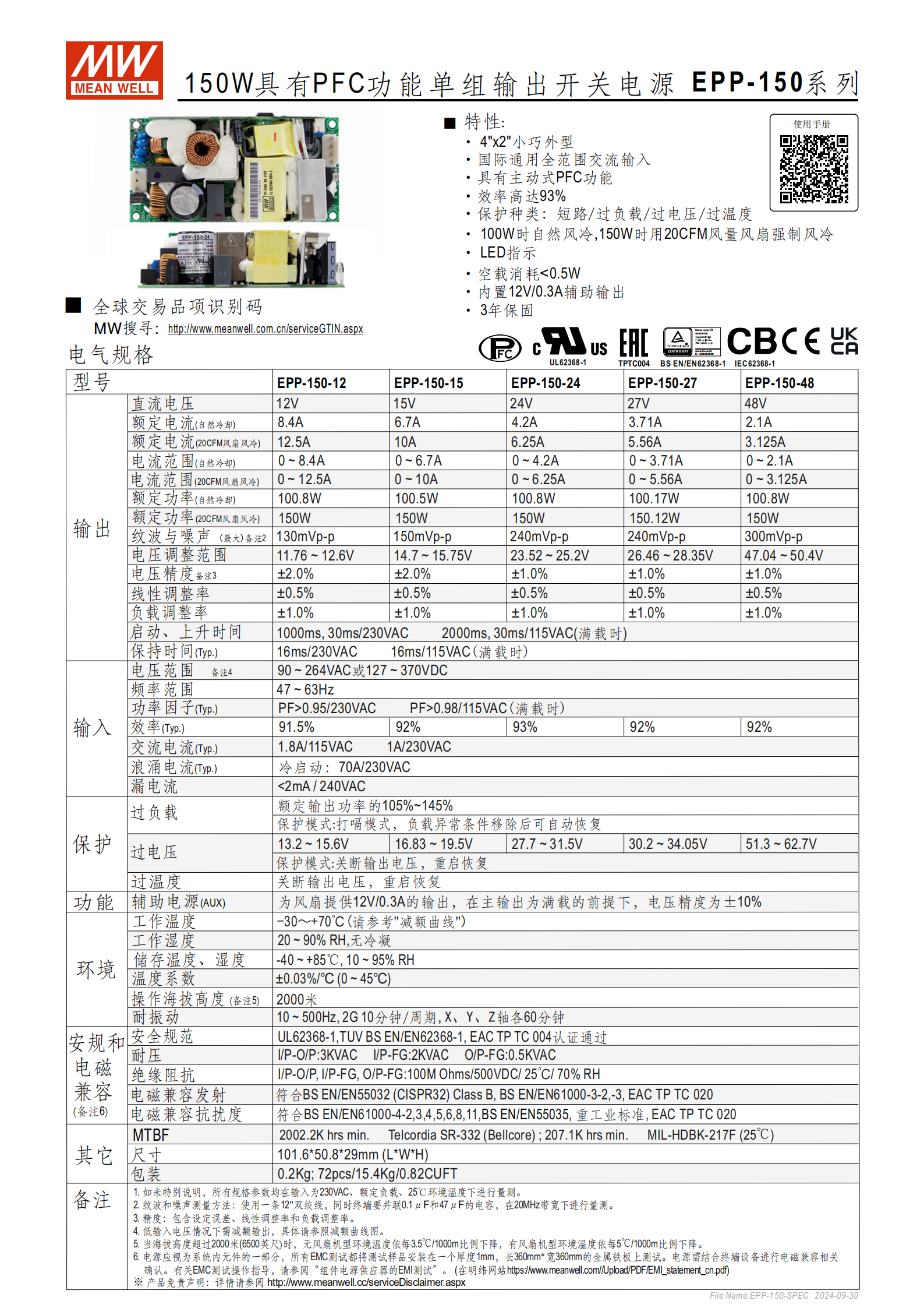 問題 2:EPP-150 系列電源的輸入輸出關鍵電氣指標有哪些,是否支持寬電壓輸入?