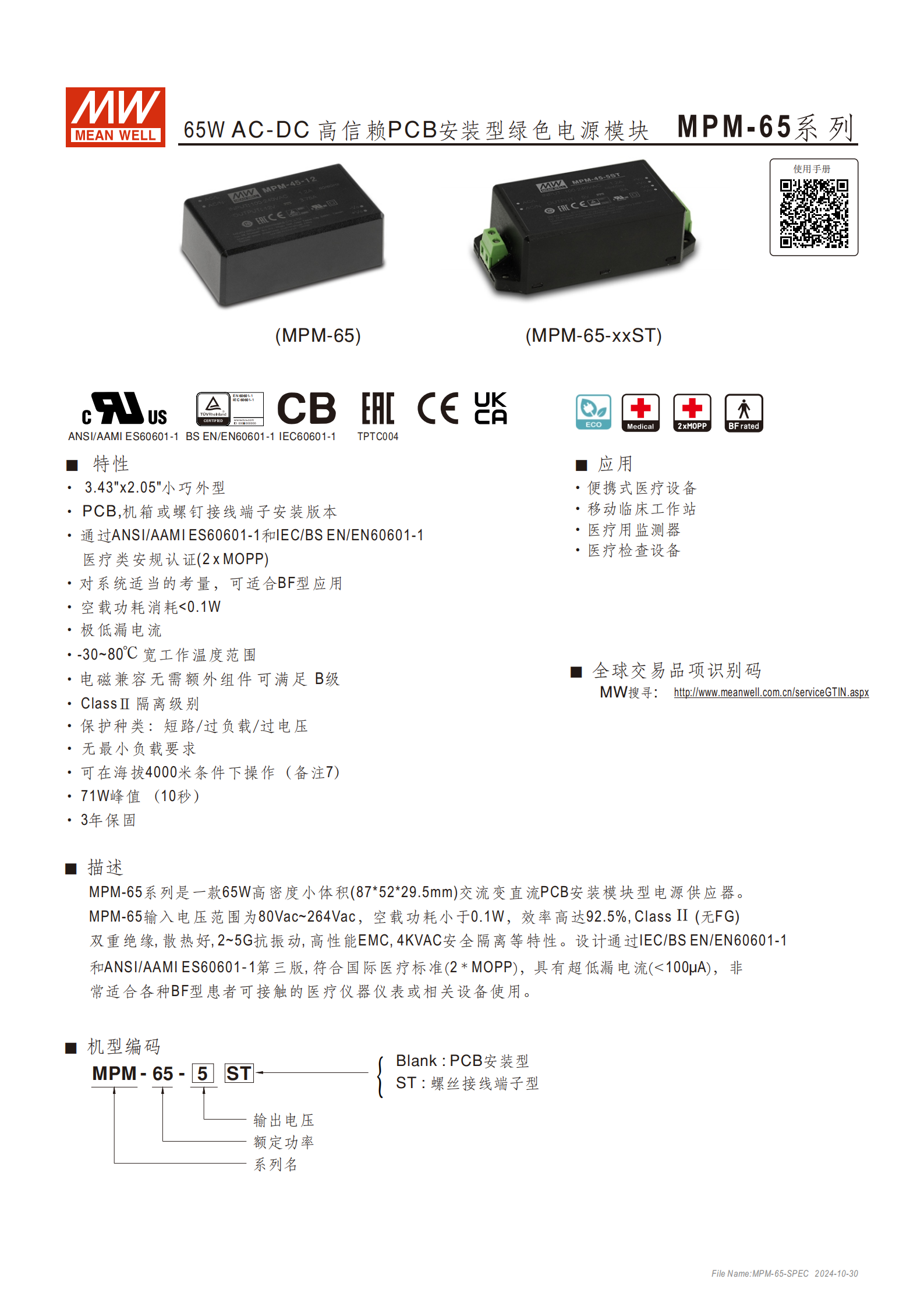 MPM-65 系列是一款65W 高密度小體積的 AC-DC 電源模塊,提供 PCB 安裝型和螺絲接線端子型兩種版本,輸出電壓涵蓋 5V、15V、24V、48V 等規(guī)格,具備 **-30~80℃寬工作溫度范圍 **、<0.1W 空載功耗、<100μA 超低漏電流、92.5% 高轉(zhuǎn)換效率及 71W 峰值功率(10 秒)等特性,通過IEC/BS EN/EN60601-1 和 ANSI/AAMI ES60601-1 醫(yī)療類安規(guī)認證(2×MOPP) ,符合 BF 型應(yīng)用要求,擁有短路 / 過負載 / 過電壓等多重保護,適用于便攜式醫(yī)療設(shè)備、醫(yī)療監(jiān)測器等場景,支持海拔 4000 米操作,提供 3 年保固。
