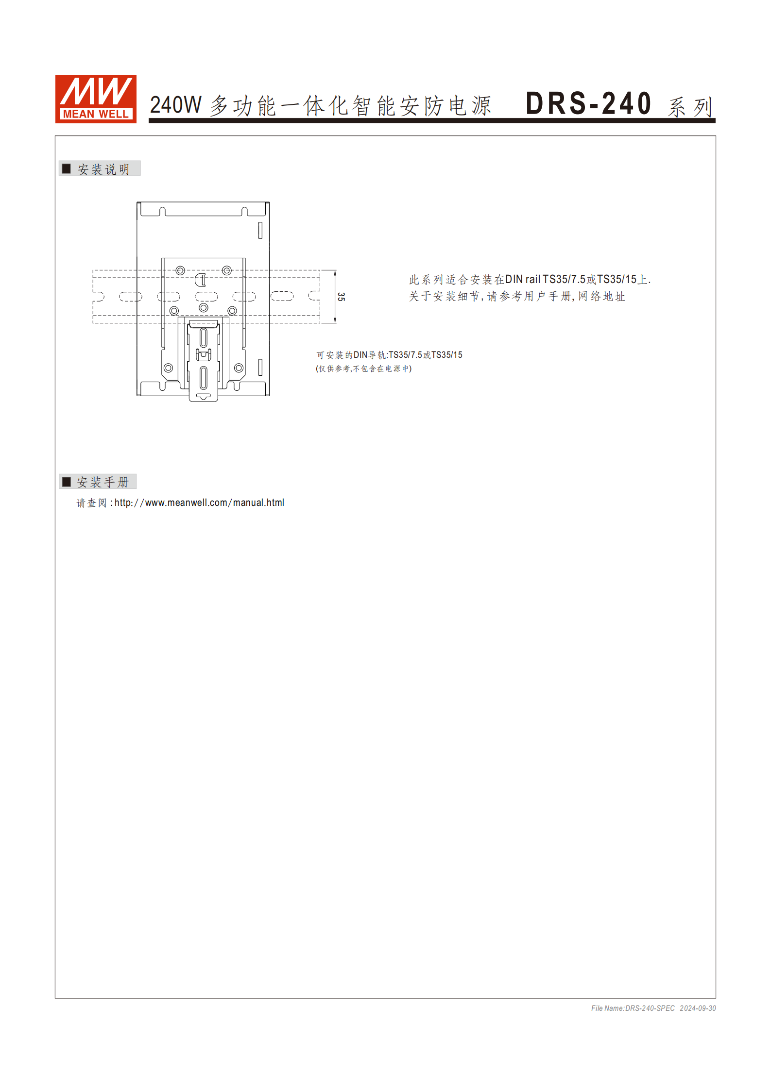 安裝要求:DIN 導(dǎo)軌 TS35/7.5 或 TS35/15,頂部距離≥40mm、底部≥20mm、兩側(cè)≥5mm(全功率運(yùn)行時(shí))。