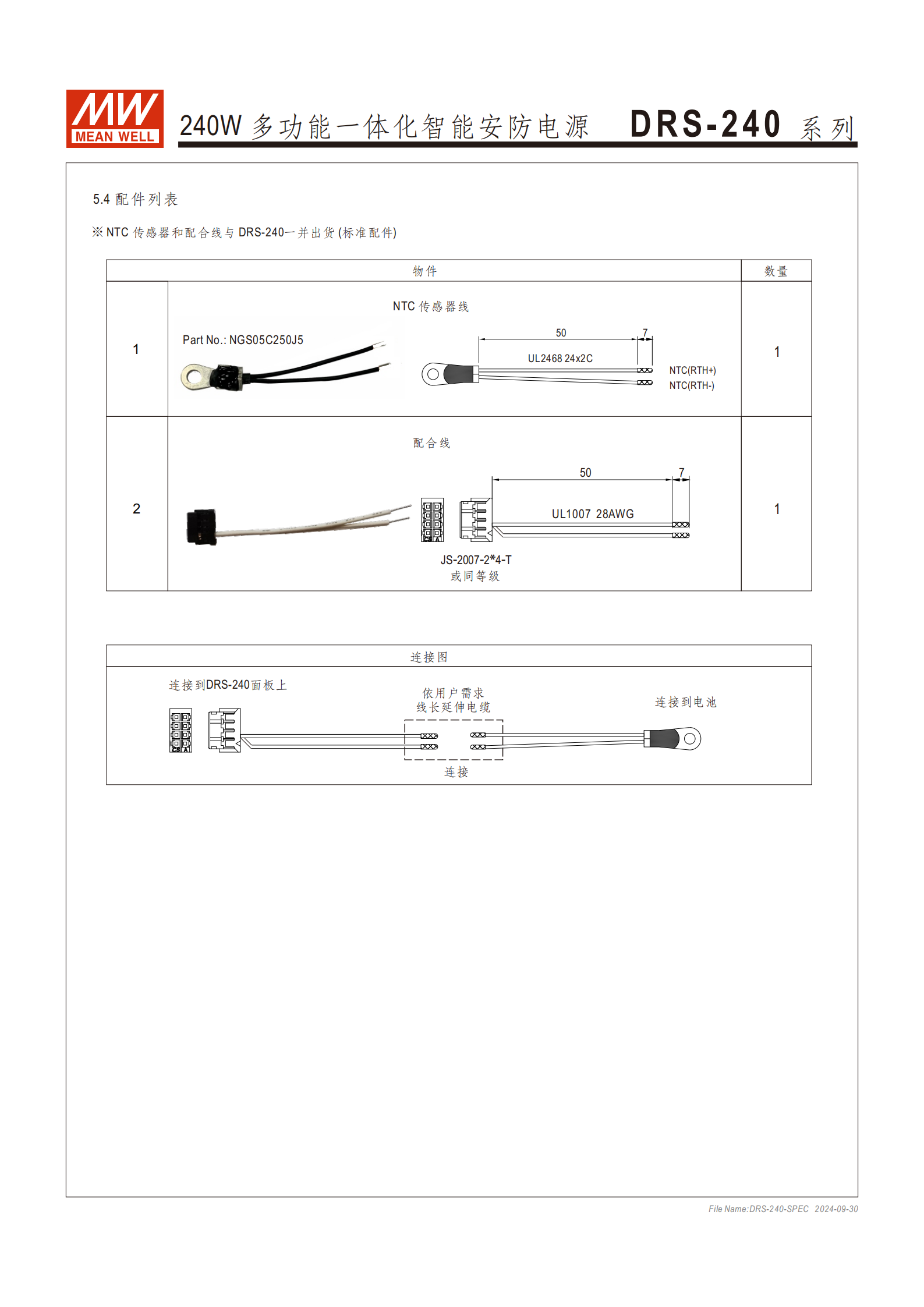 標(biāo)準(zhǔn)配件:NTC 傳感器線(NGS05C250J5)、配合線(JS-2007-2*T 或同等級(jí))。