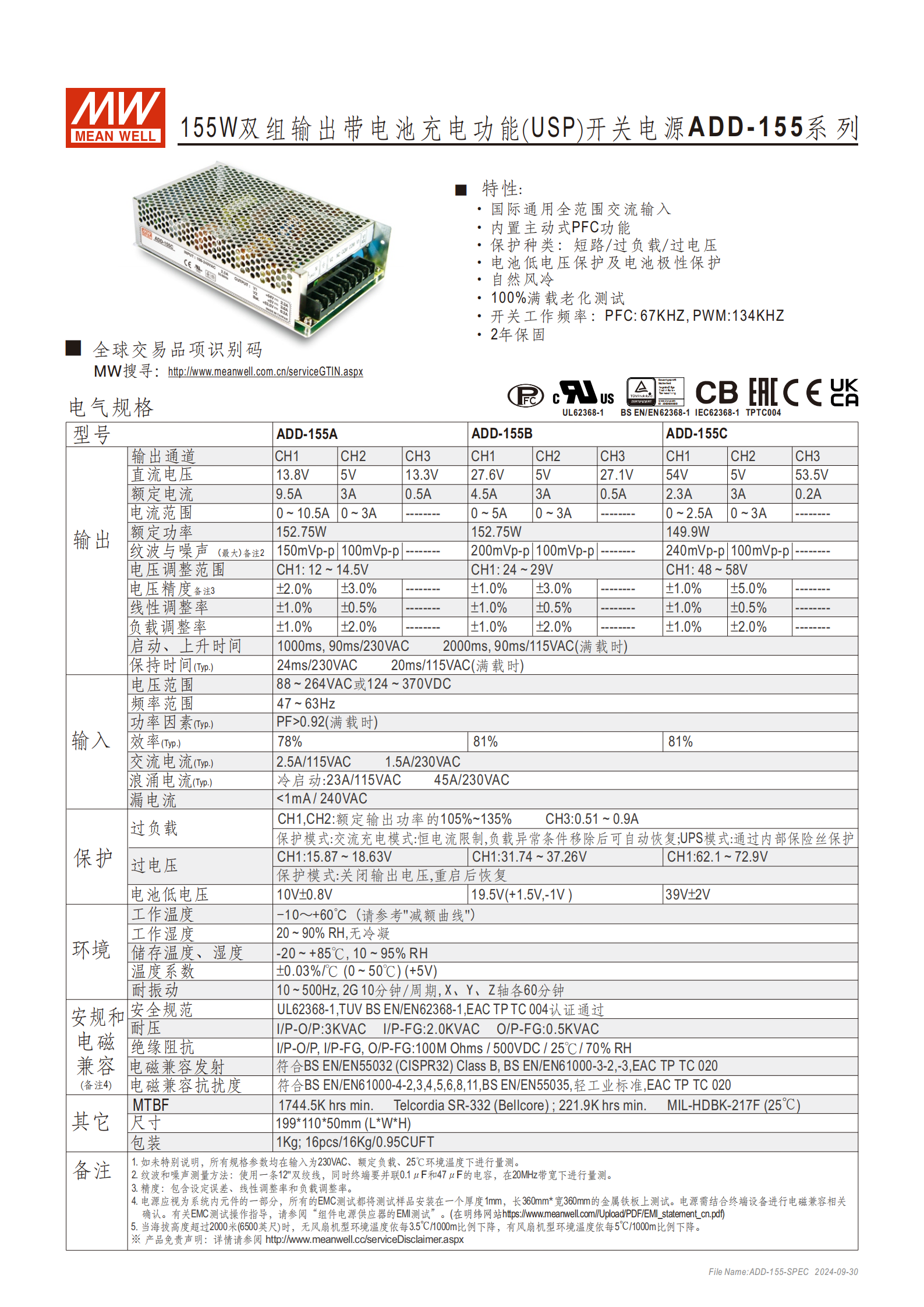 ADD-155 系列是155W 雙組輸出帶電池充電功能(UPS)的開關(guān)電源,具備88~264VAC/124~370VDC 國際通用全范圍輸入、內(nèi)置主動式 PFC(功率因數(shù) > 0.92)、短路 / 過負(fù)載 / 過電壓等多重保護(hù)及電池低電壓與極性保護(hù),分為 ADD-155A/B/C 三款型號,核心輸出差異在于 CH1 直流電壓(13.8V/27.6V/54V)與額定電流(9.5A/4.5A/2.3A),CH2 均為 5V/3A 輸出,CH3 為輔助輸出,產(chǎn)品通過 UL62368-1 等多項(xiàng)安規(guī)認(rèn)證,自然風(fēng)冷設(shè)計(jì)、100% 滿載老化測試,提供 2 年保固,適用于需 UPS 備份與電池充電的場景。
