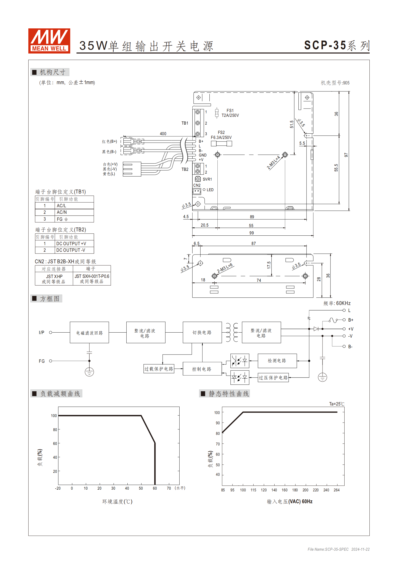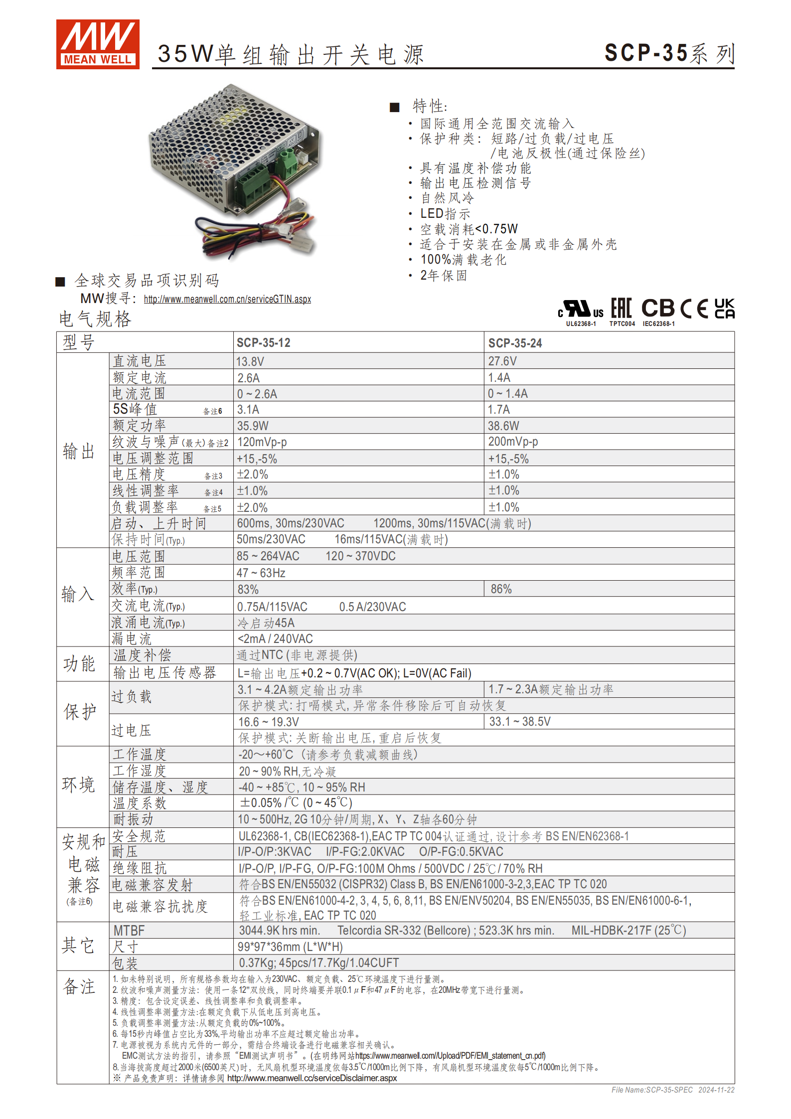 型號(hào)分類:2 個(gè)核心型號(hào),關(guān)鍵參數(shù)如下表:| 型號(hào) | 直流輸出電壓 | 額定電流 | 電流范圍 | 5S 峰值電流 | 額定功率 ||------|--------------|----------|----------|------------|----------|| SCP-35-12 | 13.8V | 2.6A | 0~2.6A | 3.1A | 35.9W || SCP-35-24 | 27.6V | 1.4A | 0~1.4A | 1.7A | 38.6W |