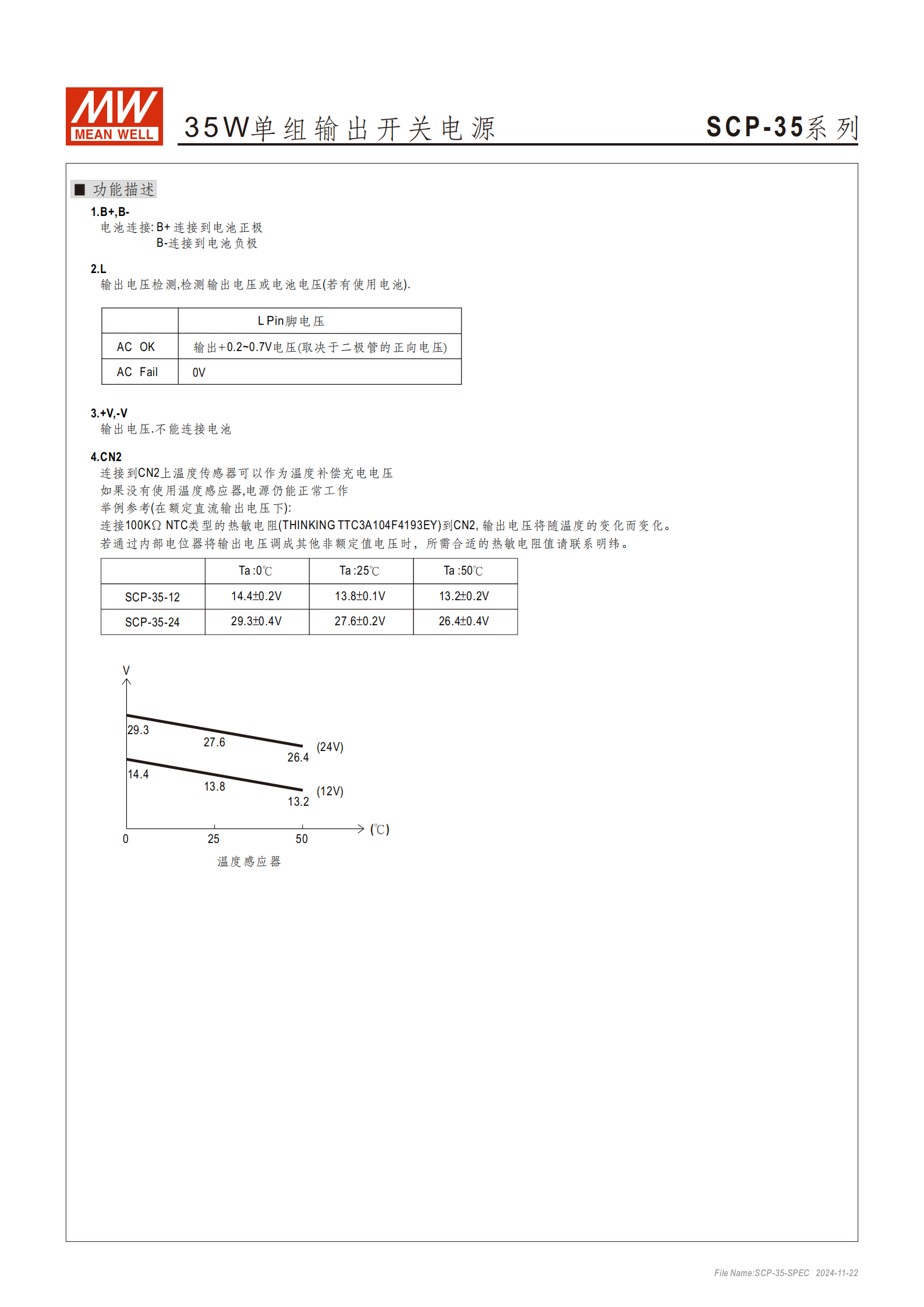 溫度補(bǔ)償:通過 NTC(非電源提供)實(shí)現(xiàn),連接 100KΩ NTC 熱敏電阻時(shí)電壓隨溫度變化,具體如下表:| 型號(hào) | Ta=0°C | Ta=25°C | Ta=50°C ||------|---------|---------|---------|| SCP-35-12 | 14.4±0.2V | 13.8±0.1V | 13.2±0.2V || SCP-35-24 | 29.3±0.4V | 27.6±0.2V | 26.4±0.4V |