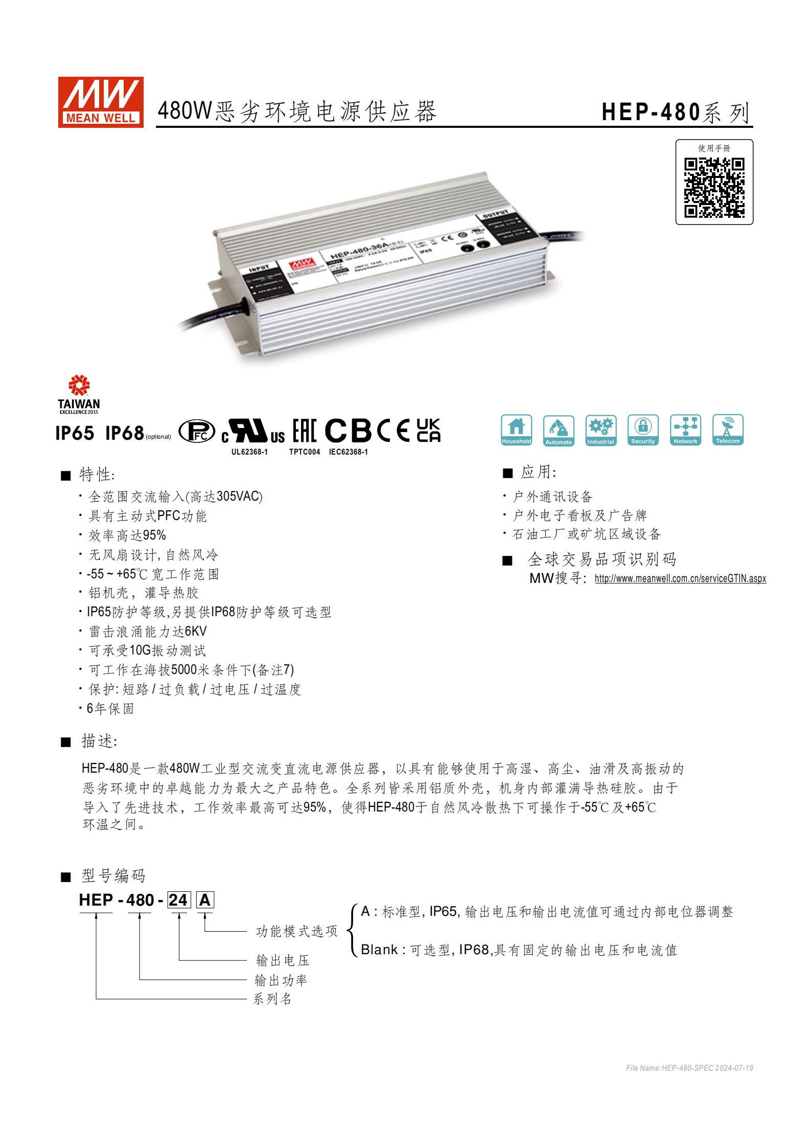 HEP-480 系列是480W 工業(yè)型交流變直流電源供應(yīng)器,具備 **-55~+65℃寬工作溫度范圍 **、IP65 防護(hù)等級(jí)(可選 IP68) 、95% 最高效率及主動(dòng)式 PFC 功能,支持85~264VAC 全范圍交流輸入,通過 UL62368-1 等多項(xiàng)認(rèn)證,擁有短路 / 過負(fù)載等多重保護(hù),采用鋁機(jī)殼灌導(dǎo)熱膠、無(wú)風(fēng)扇自然風(fēng)冷設(shè)計(jì),可耐受 10G 振動(dòng)、適應(yīng) 5000 米海拔,適用于戶外通訊設(shè)備、石油工廠等惡劣環(huán)境,提供 6 年保固,包含 24V/36V/48V/54V 四種輸出電壓型號(hào),部分型號(hào)可通過內(nèi)部電位器調(diào)整電壓和電流。