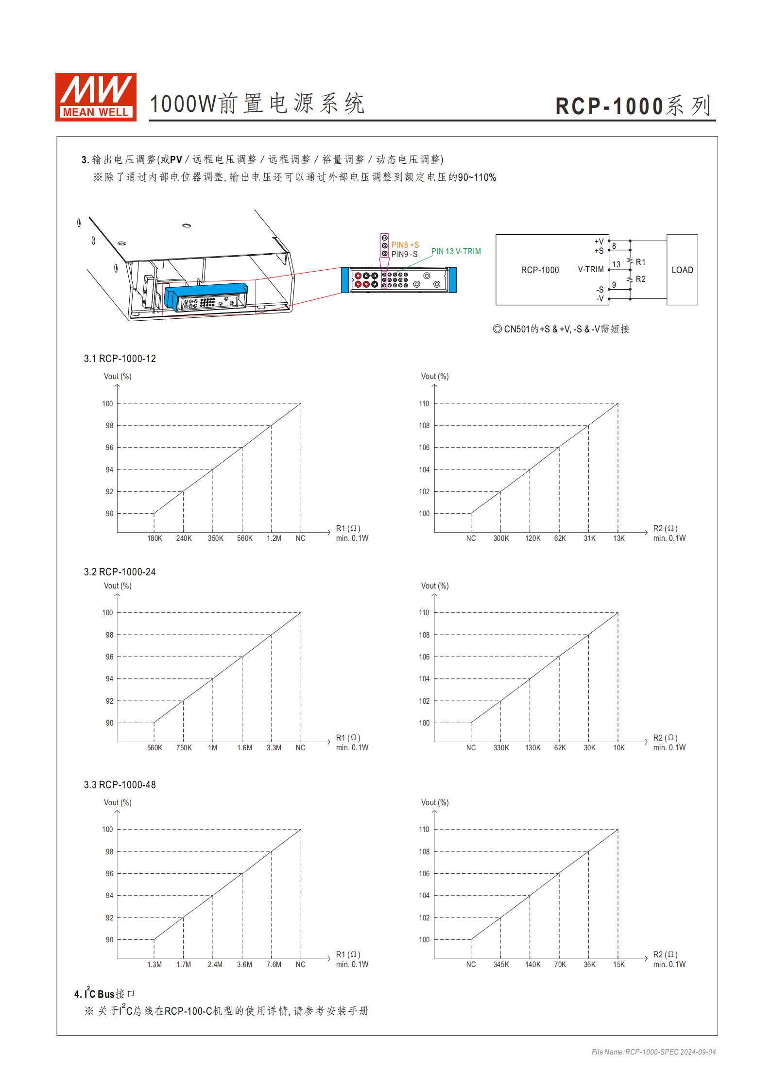輸出電壓調(diào)整:范圍 90~110% 額定輸出,需通過(guò) R1/R2 電阻搭配調(diào)整(三款機(jī)型電阻參數(shù)不同)