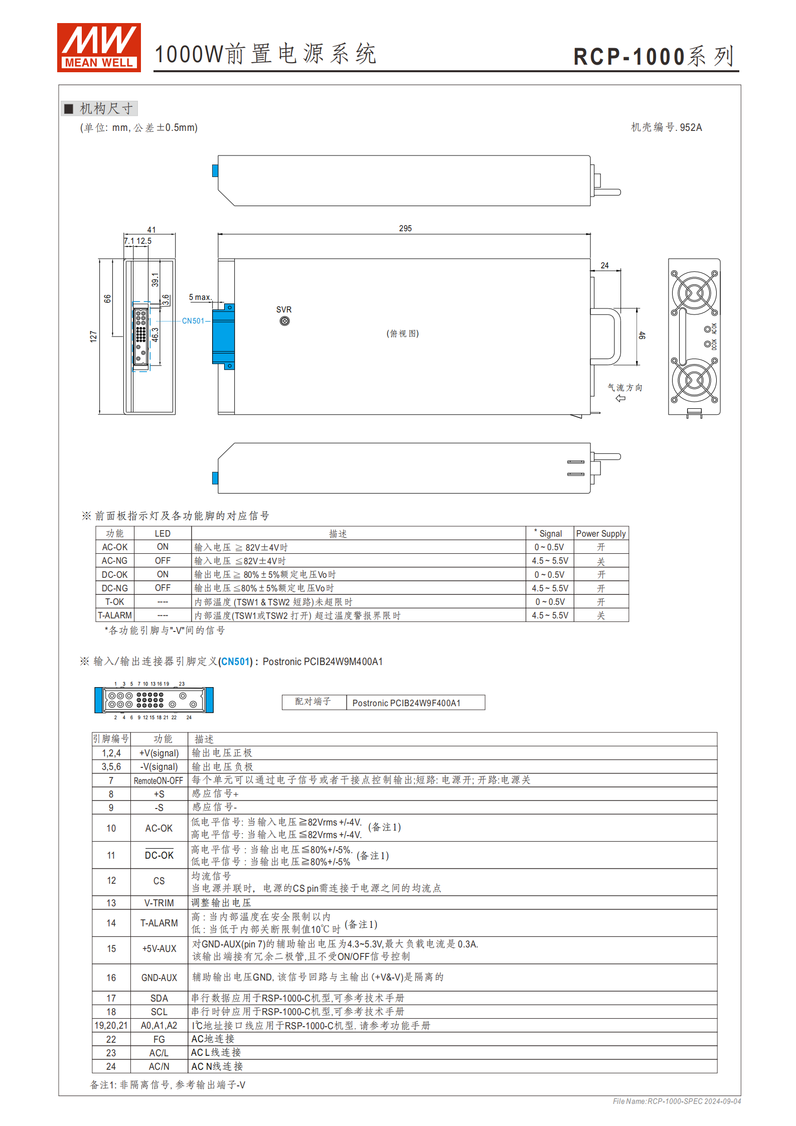 連接器:Postronic PCIB24W9M400A1(CN501),共 24 個(gè)引腳(含輸出正負(fù)極、控制信號(hào)、輔助電源等)
