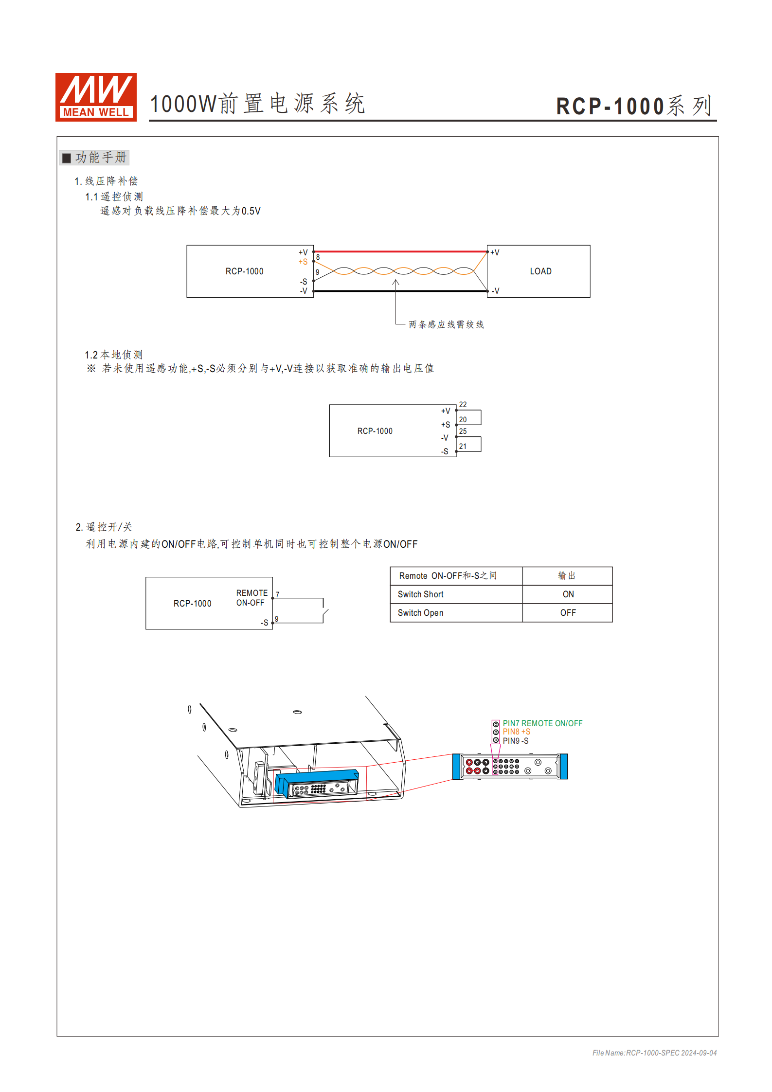 線壓降補(bǔ)償:遙控偵測(cè)可補(bǔ)償線壓降達(dá) 0.5V,未使用時(shí)需將 + S/-S 與 + V/-V 短接