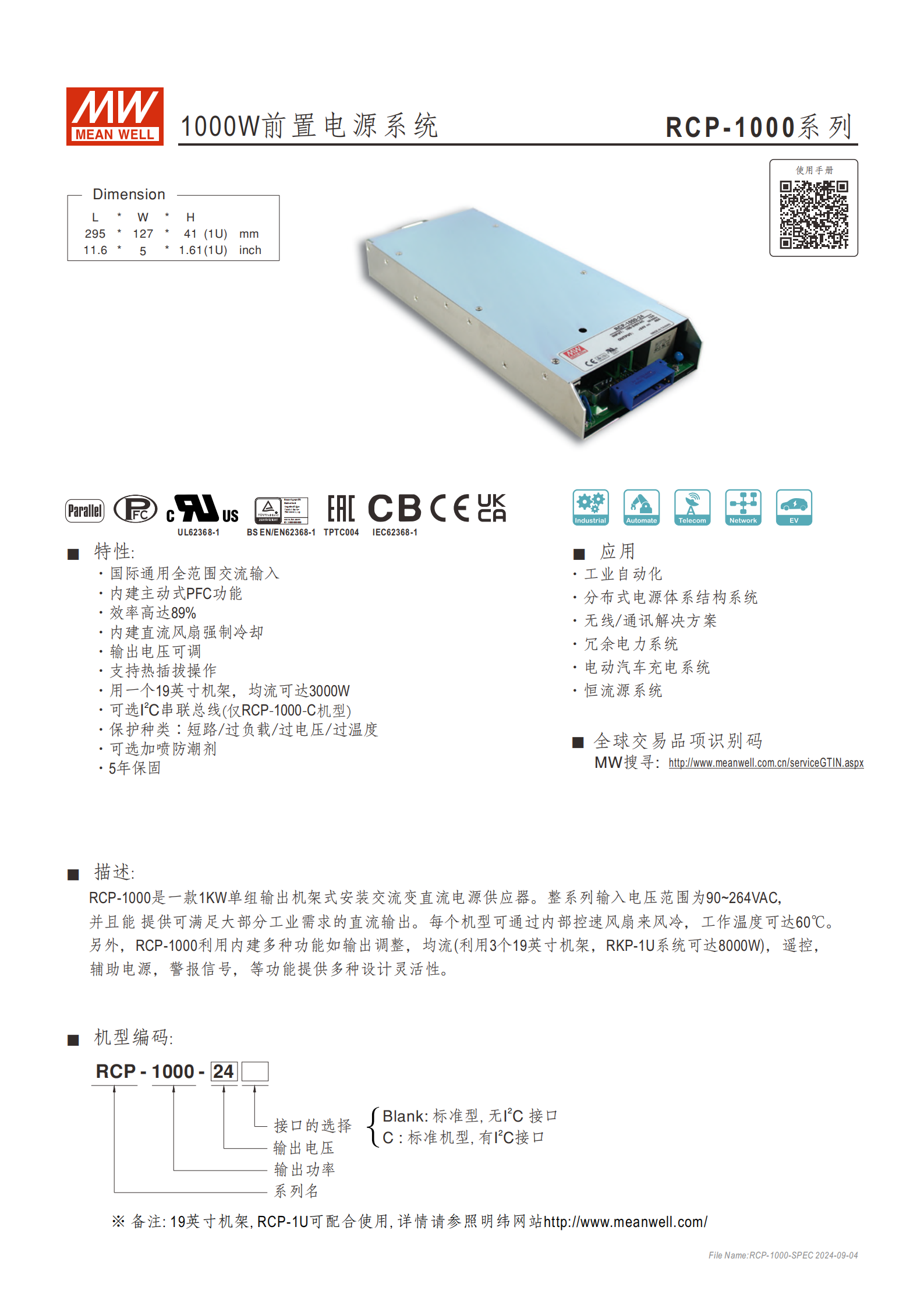 RCP-1000 系列是 1KW 單組輸出機(jī)架式交流變直流電源供應(yīng)器,輸入電壓范圍 90~264VAC,工作溫度 - 20~+60°C,效率高達(dá) 89%,包含 RCP-1000-12(12V/60A/720W)、RCP-1000-24(24V/40A/960W)、RCP-1000-48(48V/21A/1008W)三款機(jī)型,具備輸出電壓可調(diào)、均流、遙控、輔助電源、多重保護(hù)(短路 / 過(guò)負(fù)載 / 過(guò)電壓 / 過(guò)溫度) 等功能,支持熱插拔和 19 英寸機(jī)架安裝(3 臺(tái)均流可達(dá) 3000W,RKP-1U 系統(tǒng)可達(dá) 8000W),可選 I2C 串聯(lián)總線(僅 C 機(jī)型)和防潮劑,通過(guò)多項(xiàng)國(guó)際安全認(rèn)證,5 年保固,廣泛應(yīng)用于工業(yè)自動(dòng)化、通訊、電動(dòng)汽車充電等領(lǐng)域。