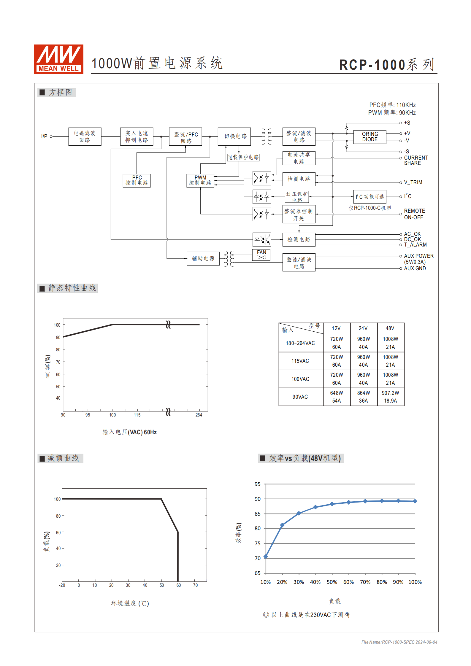 | RCP-1000-48 | 48V(46.3~49.7V) | 21A | 1008W | 高壓大功率場(chǎng)景,如電動(dòng)汽車充電系統(tǒng)、冗余電力系統(tǒng) |