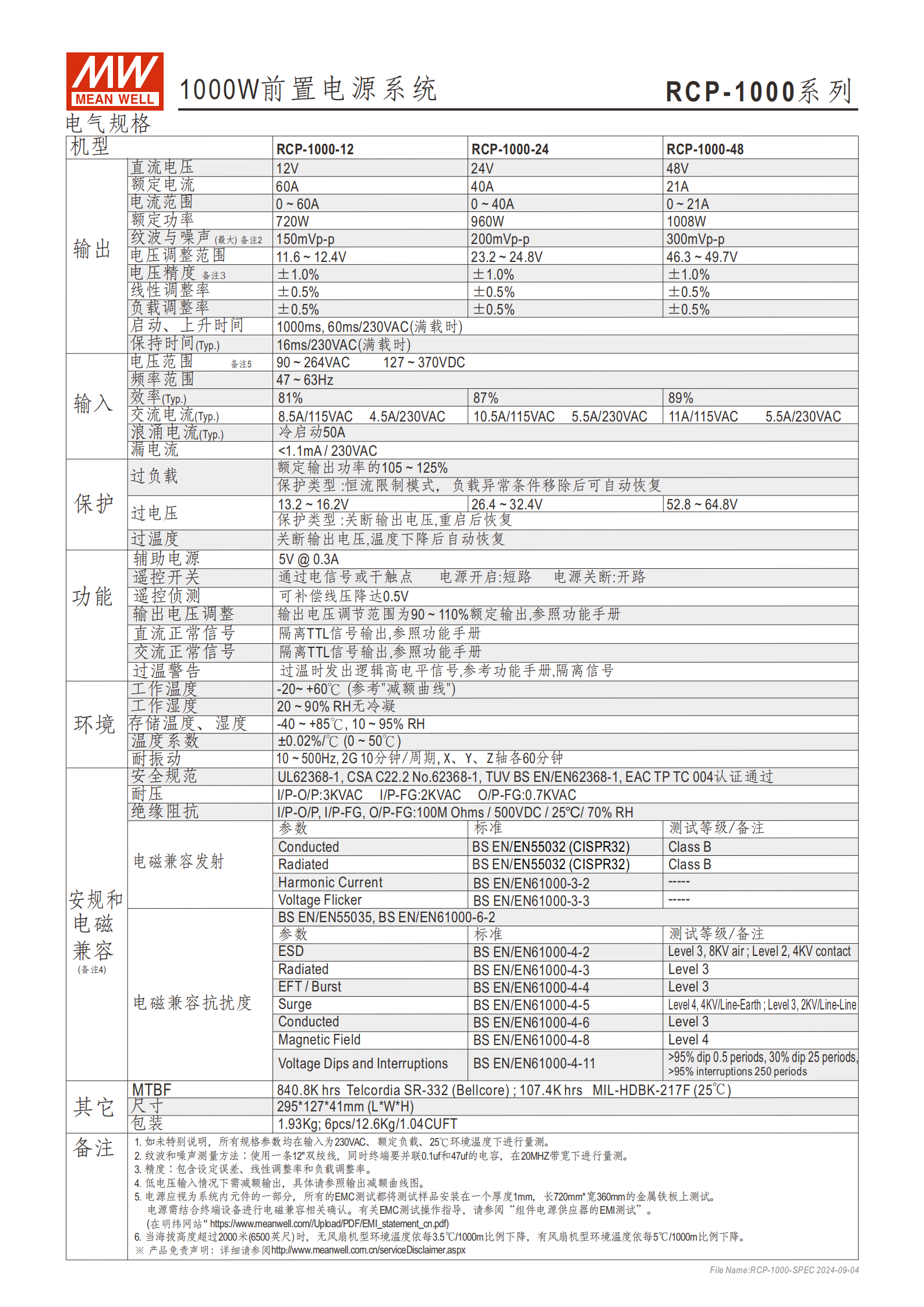 | 參數(shù) | RCP-1000-12 | RCP-1000-24 | RCP-1000-48 |