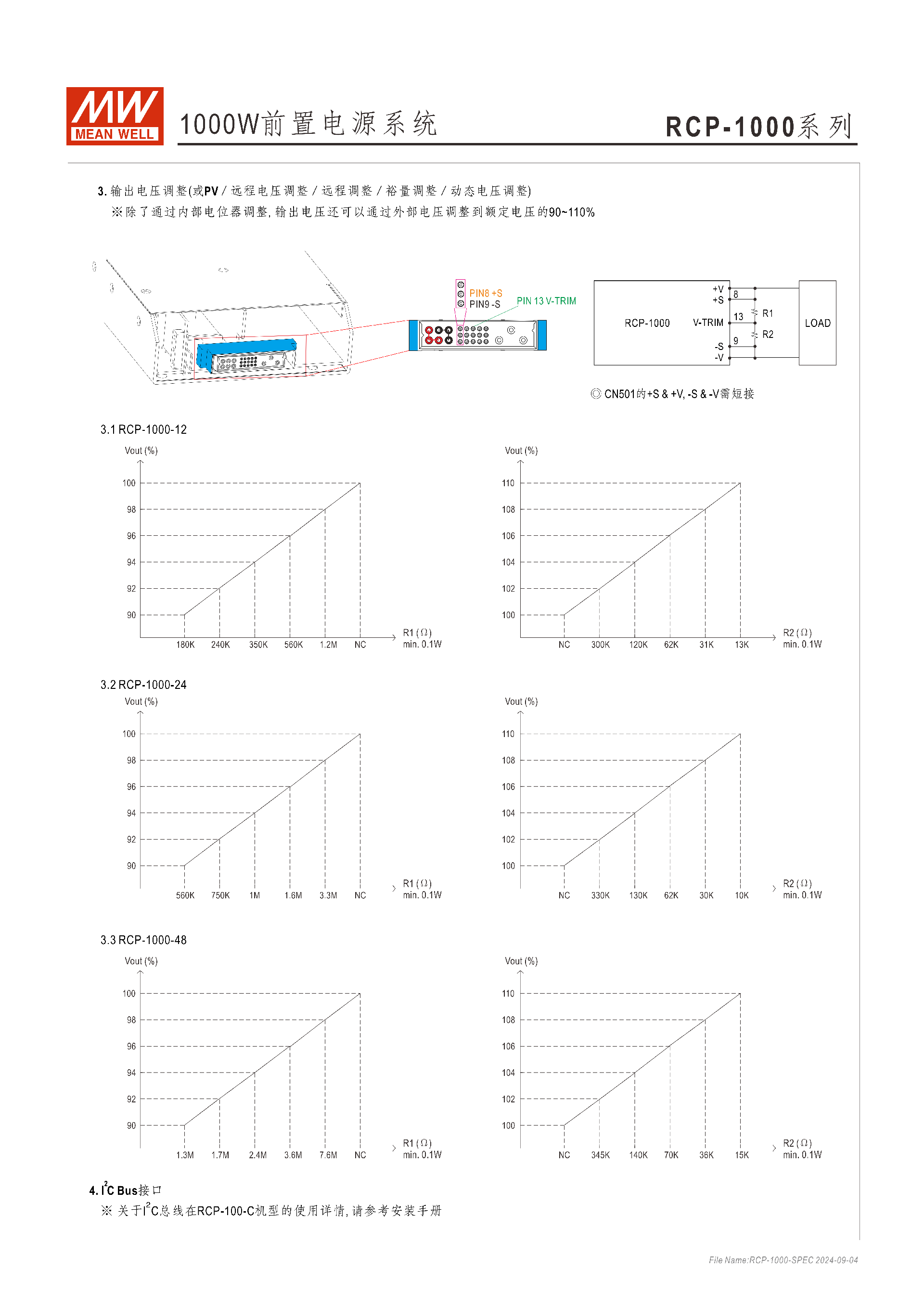 輸出電壓調(diào)整:范圍 90~110% 額定輸出,需通過 R1/R2 電阻搭配調(diào)整(三款機型電阻參數(shù)不同)