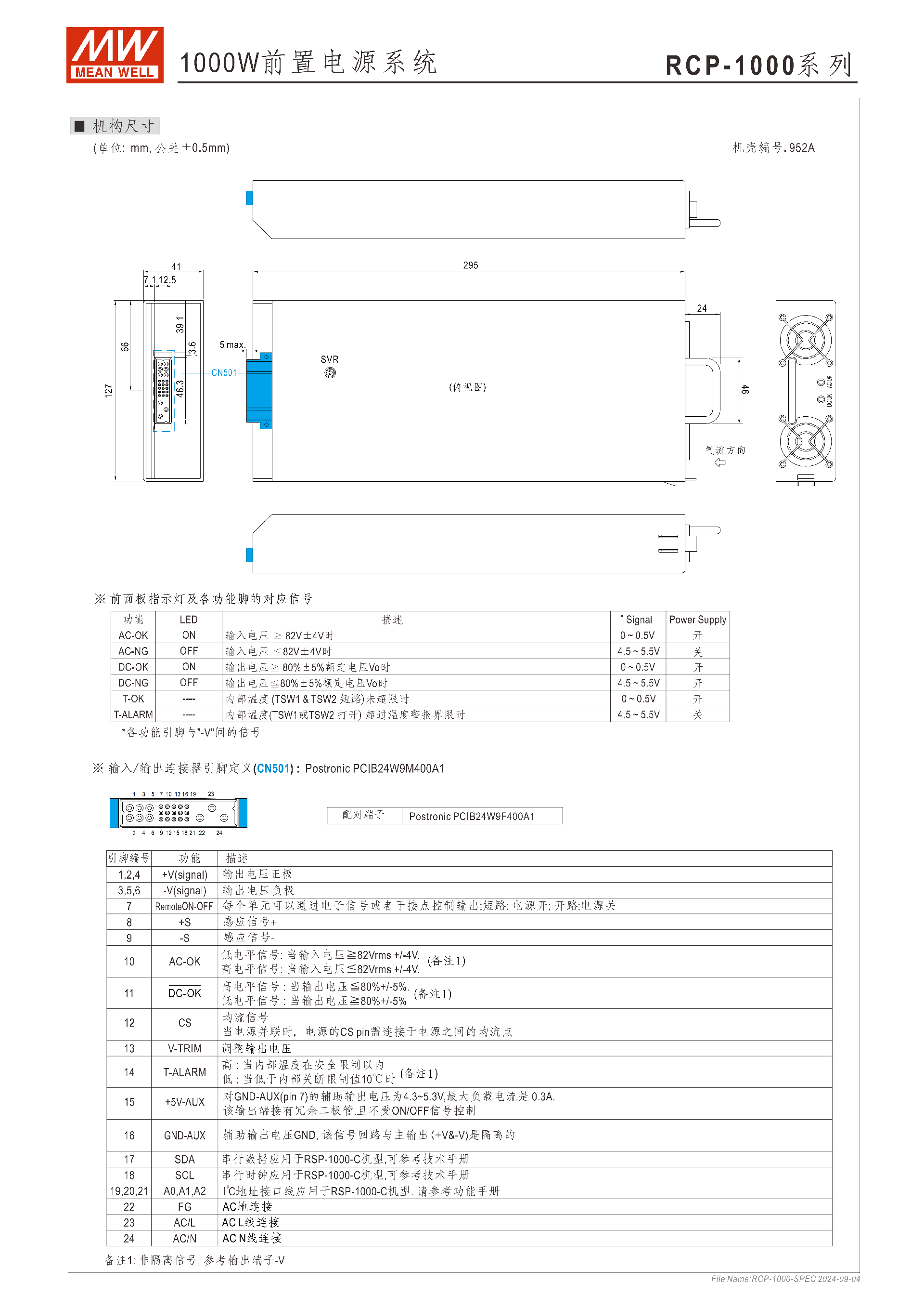 連接器:Postronic PCIB24W9M400A1(CN501),共 24 個引腳(含輸出正負極、控制信號、輔助電源等)