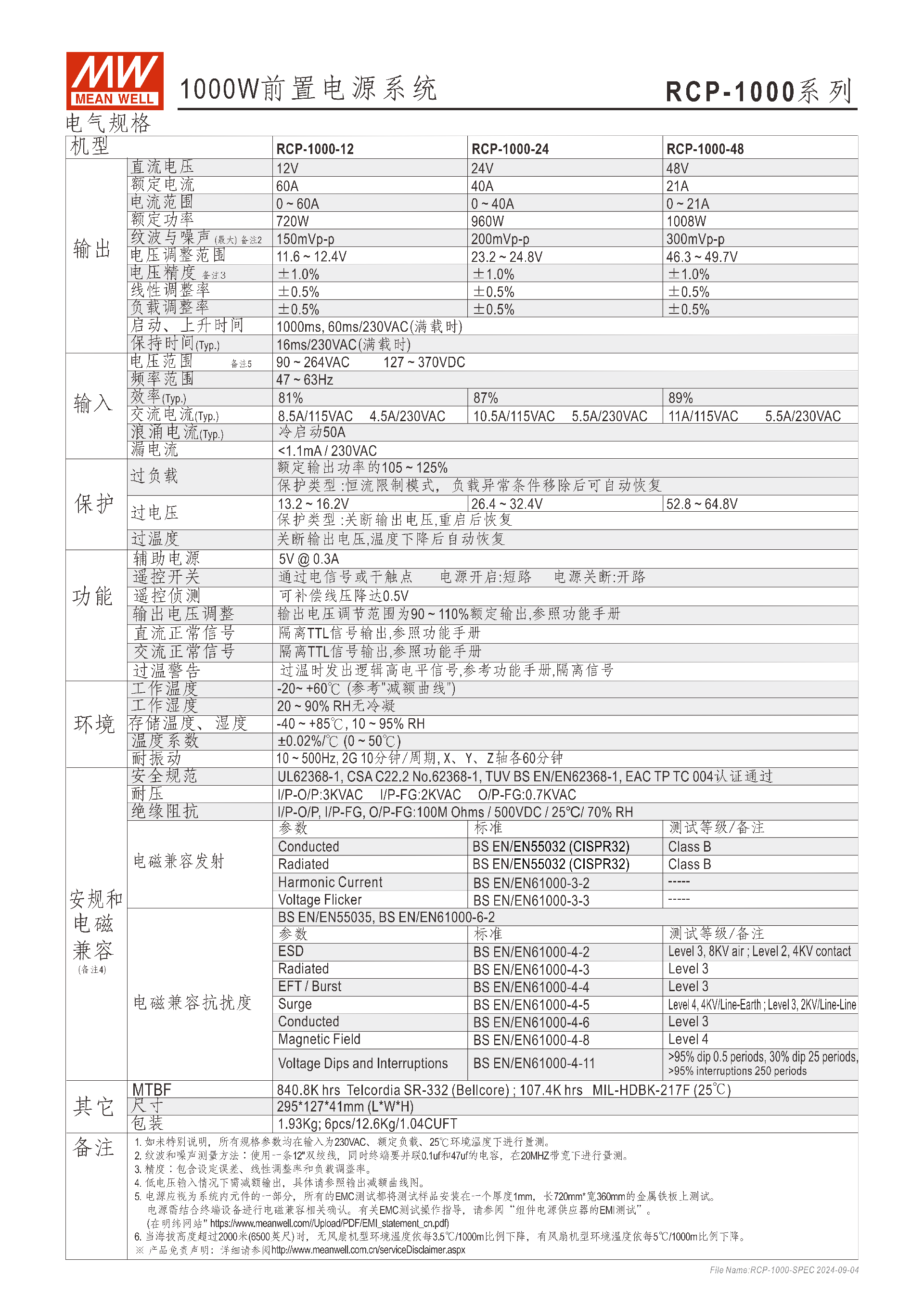 | 參數(shù) | RCP-1000-12 | RCP-1000-24 | RCP-1000-48 |
