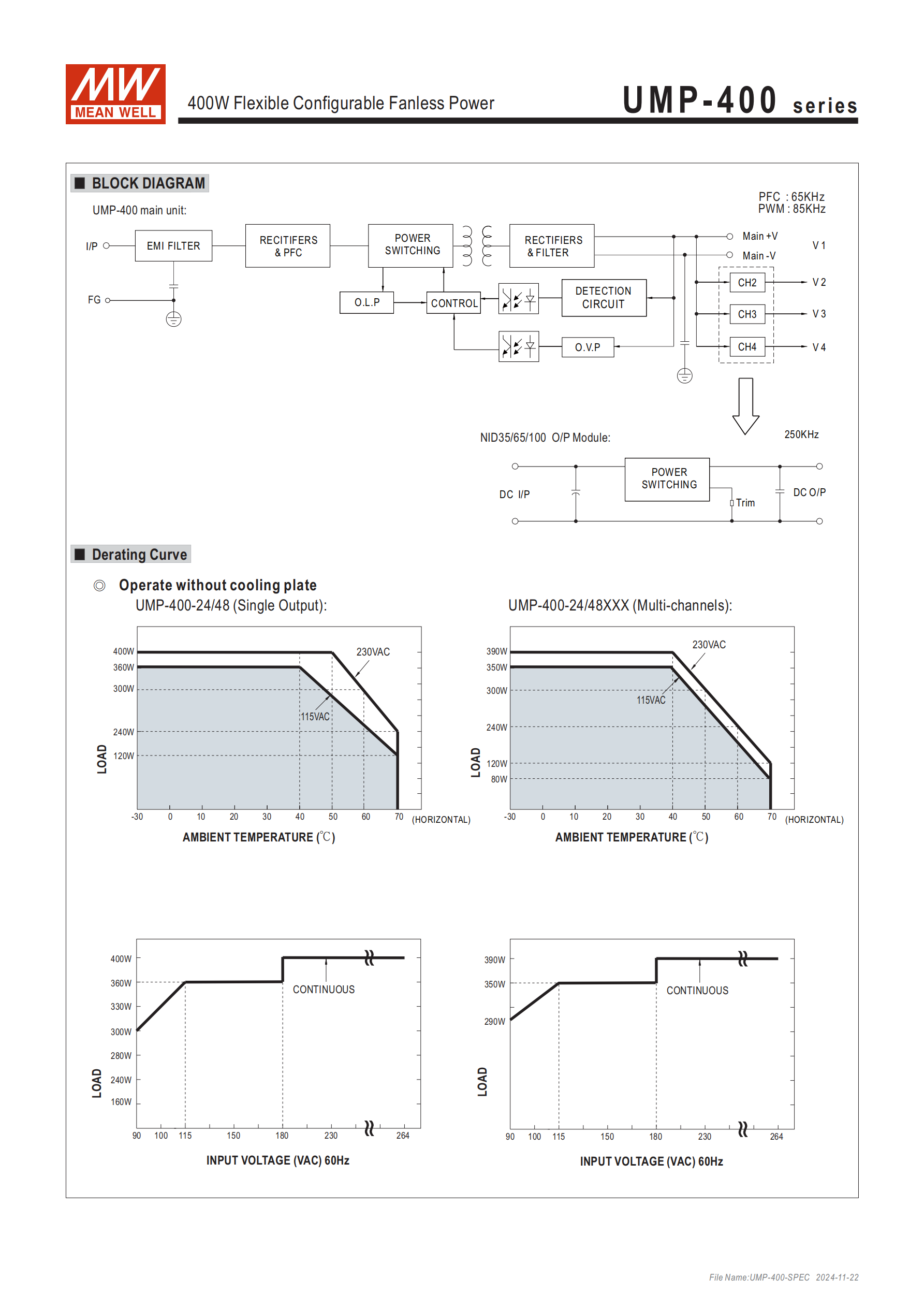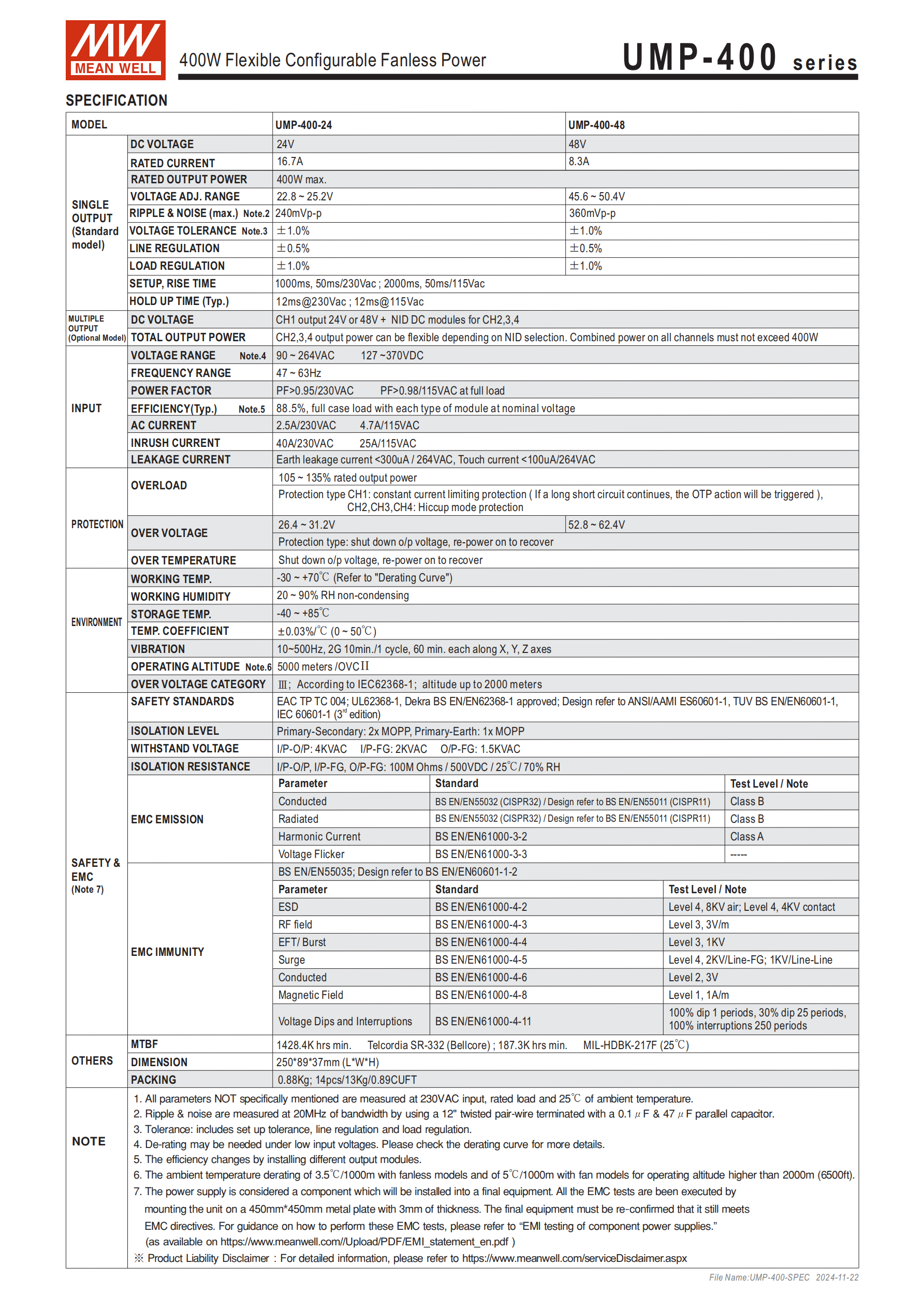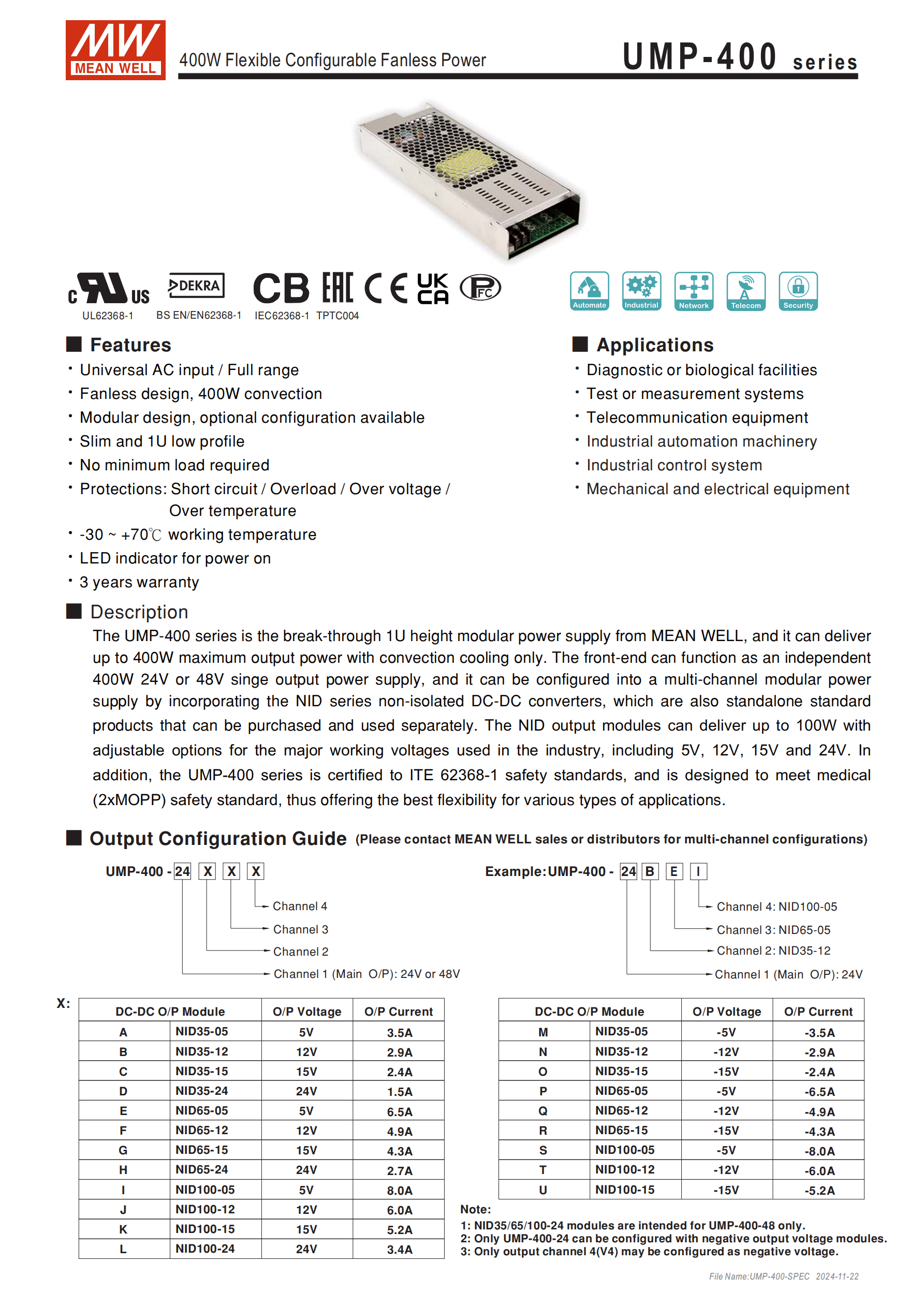 核心定位:明緯推出的400W 多配置無風(fēng)扇電源,型號為 UMP-400 系列,主打模塊化靈活配置與寬環(huán)境適應(yīng)性