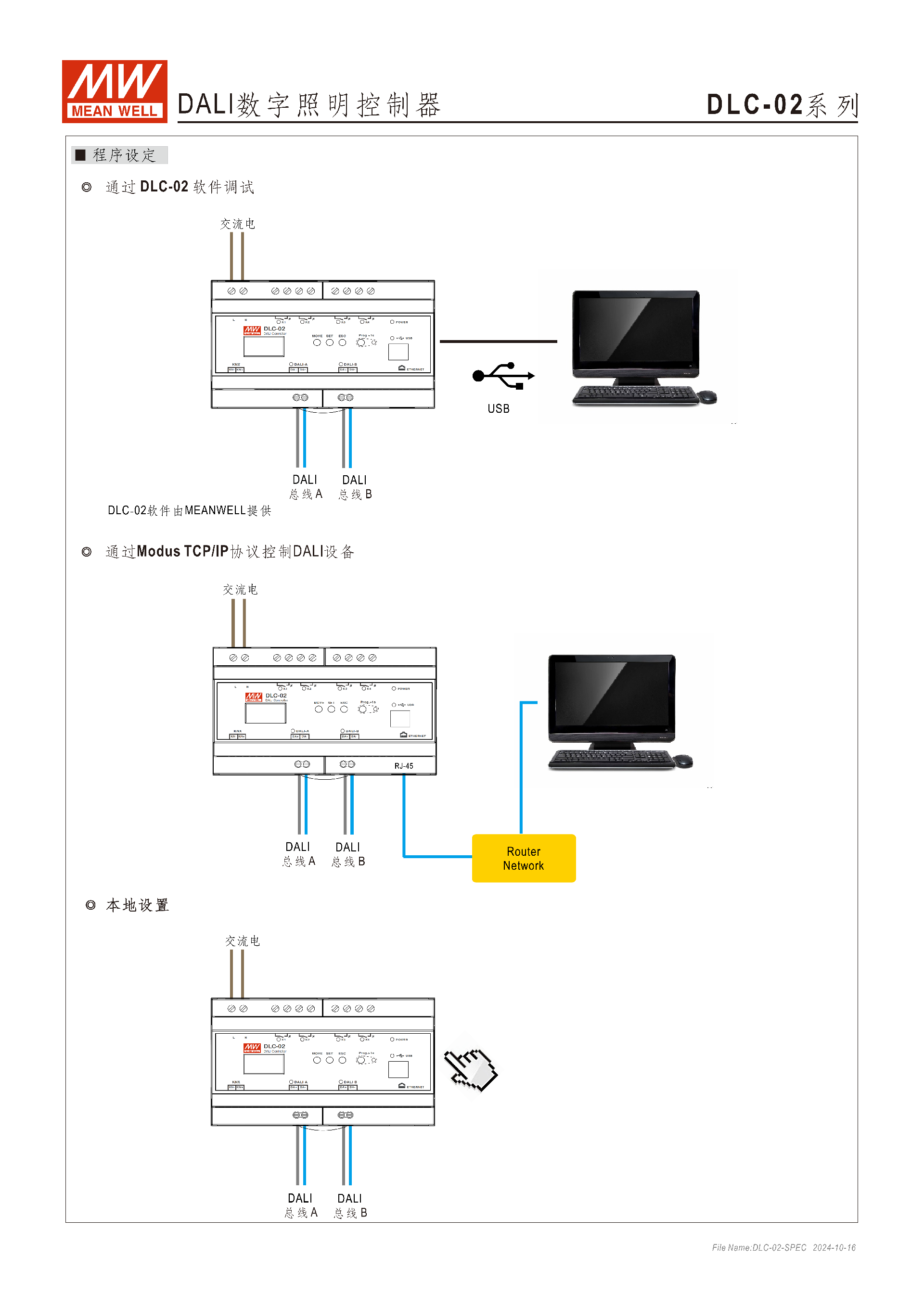 MEAN WELL DLC-02 系列是符合DALI-2 標(biāo)準(zhǔn)的多主控?cái)?shù)字照明控制器,具備兩個(gè)獨(dú)立 DALI 總線通道(每通道最大供電電流 250mA),最多可連接 128 個(gè) DALI 驅(qū)動器和 24 個(gè) DALI 輸入設(shè)備,內(nèi)置 4 個(gè) 250V/5A 繼電器、Modbus TCP/IP 協(xié)議及 OLED 顯示屏,支持 16 個(gè)場景 / 群組、255 個(gè)定時(shí)事件和 8 個(gè)序列(每序列 16 步),適配 DT8 可調(diào)色溫和多種 DALI 設(shè)備,適用于辦公室、智能家居等場景,提供 5 年保固,可通過專屬軟件實(shí)現(xiàn)簡易安裝配置。