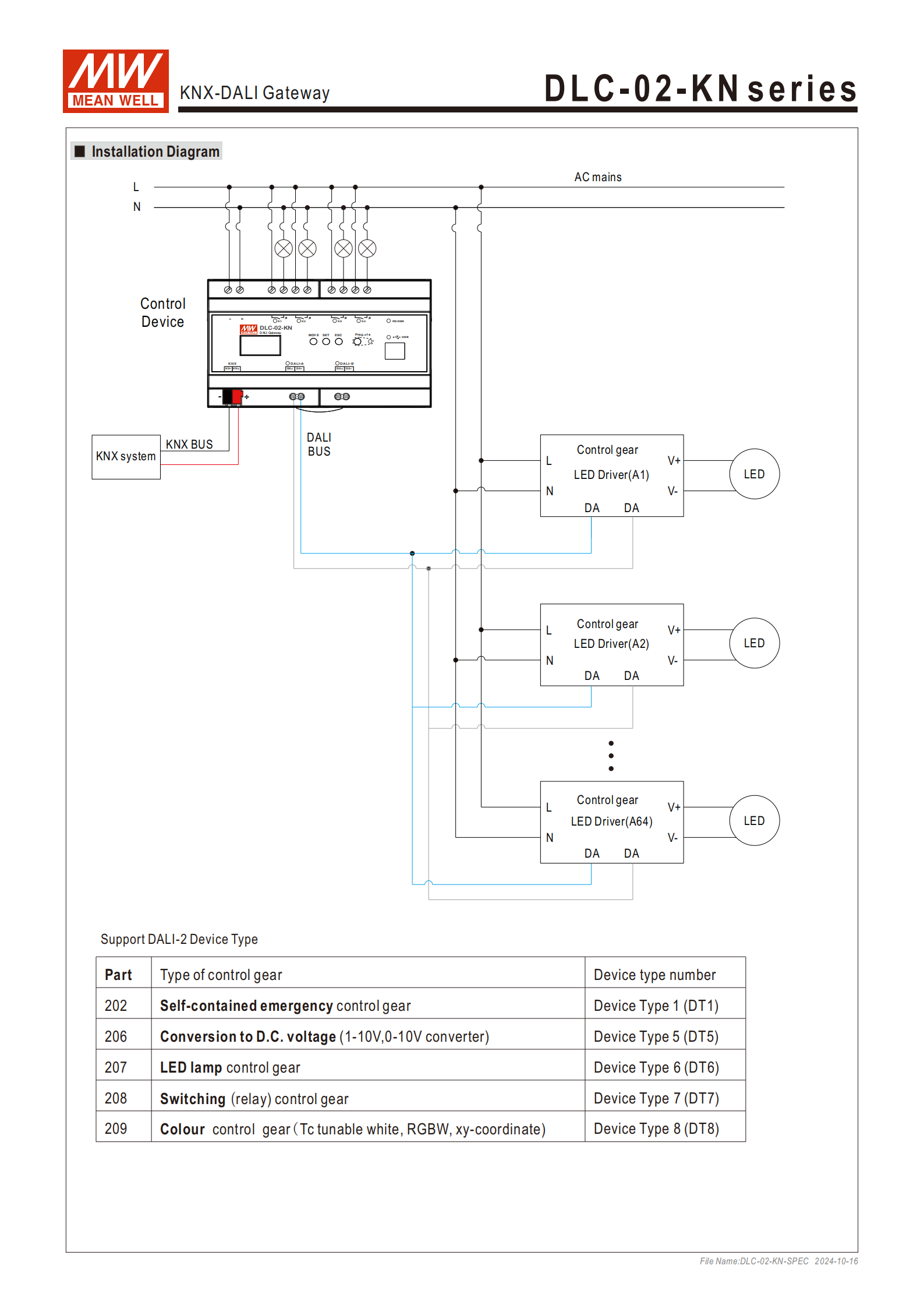 設(shè)備兼容性:支持 DALI-2 設(shè)備,兼容的設(shè)備類型如下:| DALI 部件編號 | 控制 gear 類型 | 設(shè)備類型編號 ||--------------|---------------------------------------|--------------|| 202 | 獨立應(yīng)急控制 gear | DT1 || 206 | 直流電壓轉(zhuǎn)換 gear(1-10V/0-10V 轉(zhuǎn)換器) | DT5 || 207 | LED 燈具控制 gear | DT6 || 208 | 開關(guān)(繼電器)控制 gear | DT7 || 209 | 顏色控制 gear(可調(diào)色溫、RGBW、xy 坐標(biāo)) | DT8 |