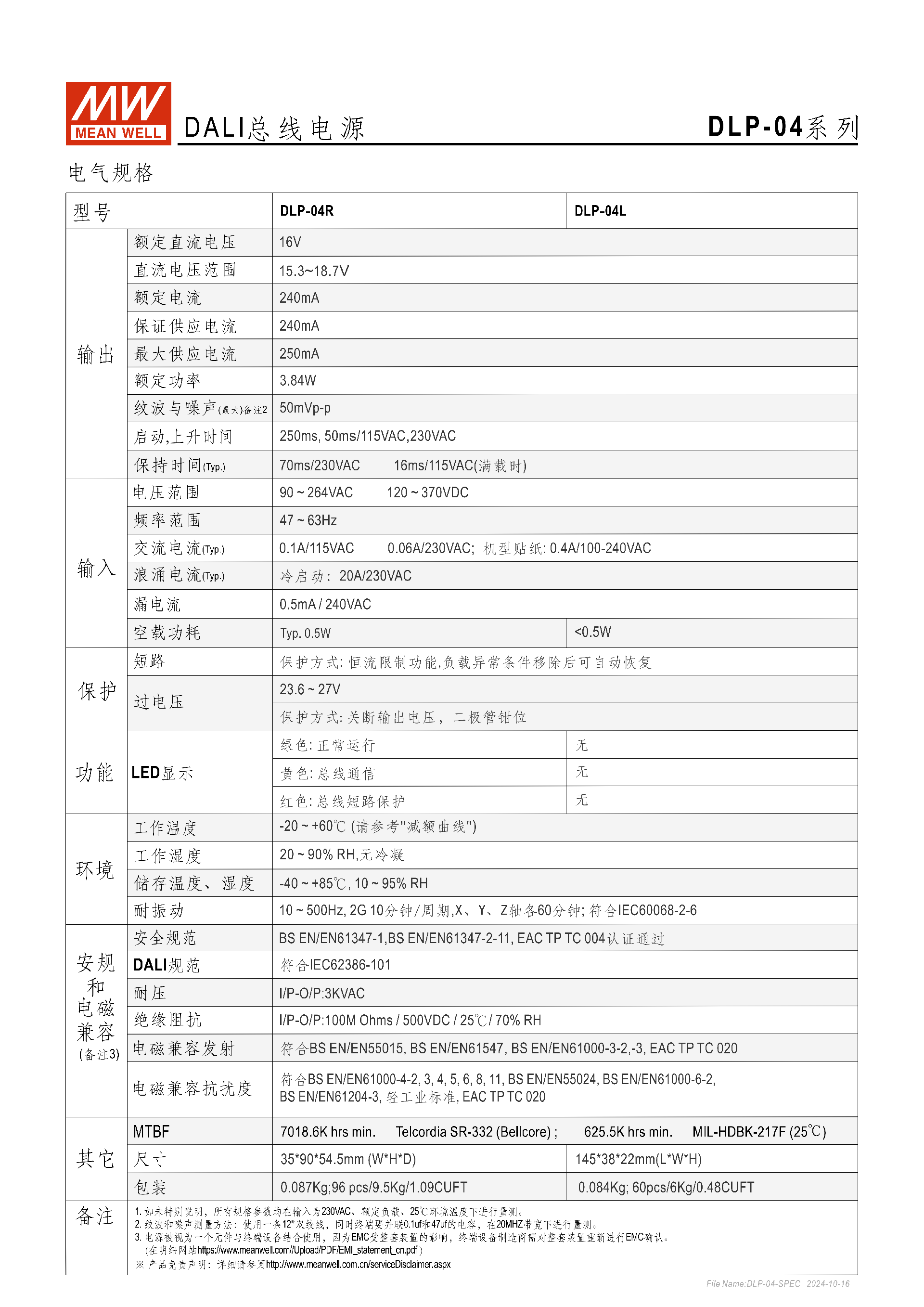 MEAN WELL 的DLP-04 系列 DALI 總線電源包含DLP-04R(導軌型) 和DLP-04L(長條型) 兩款機型,具備35mm 超薄設計(R 型)、90~264VAC 全電壓輸入、16V 額定直流輸出、240mA 保證供應電流等核心特性,支持短路 / 過電壓保護、3 色 LED 狀態(tài)指示,工作溫度范圍 **-20~+60℃**,符合多項安全與電磁兼容規(guī)范,適用于 DALI 總線及相關供電單元,提供 3 年保固,能為不帶內(nèi)置電源的 DALI 控制裝置和設備提供安全可靠的供電解決方案。