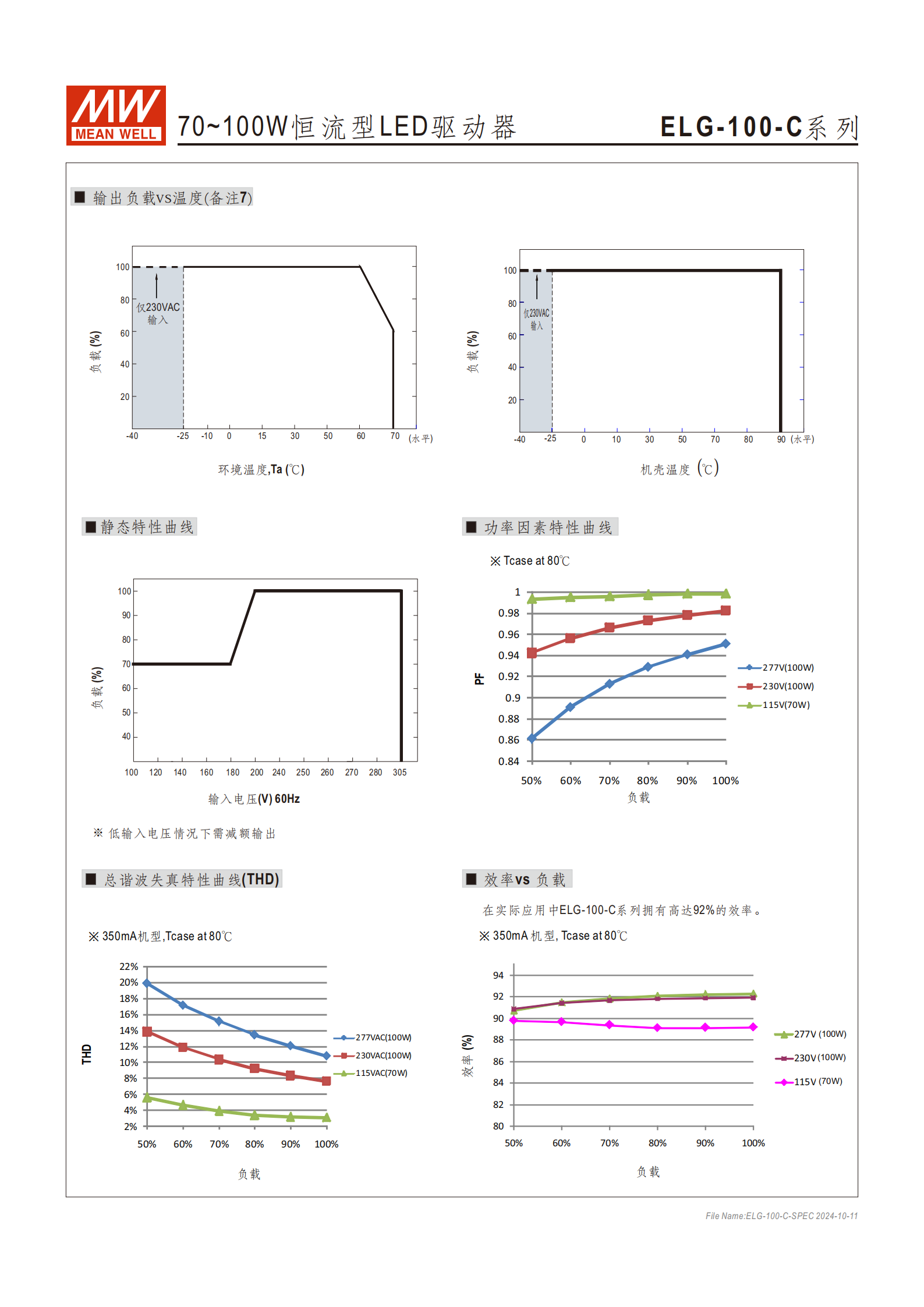 | 350mA | ELG-100-C350 | 175~350mA | 297V | 100.1W(200~305VAC 輸入)/70W(100~180VAC 輸入) |